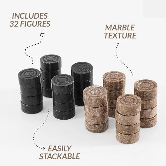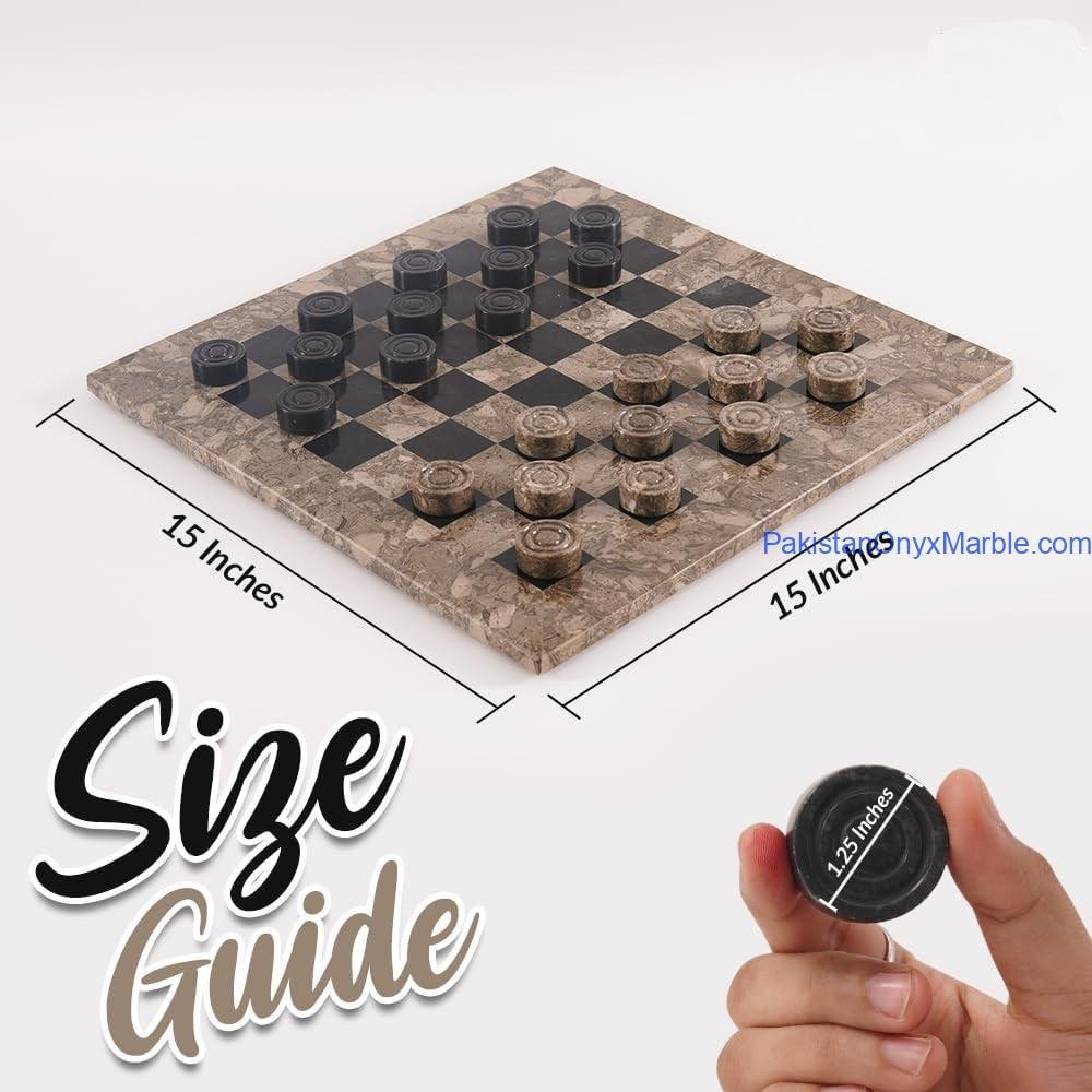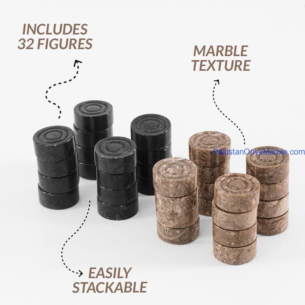 Checker sets are manufactured using natural marble, onyx, and travertine stone sourced from Pakistan’s stone quarries. These materials are widely valued for their durability, natural patterns, and premium aesthetic.