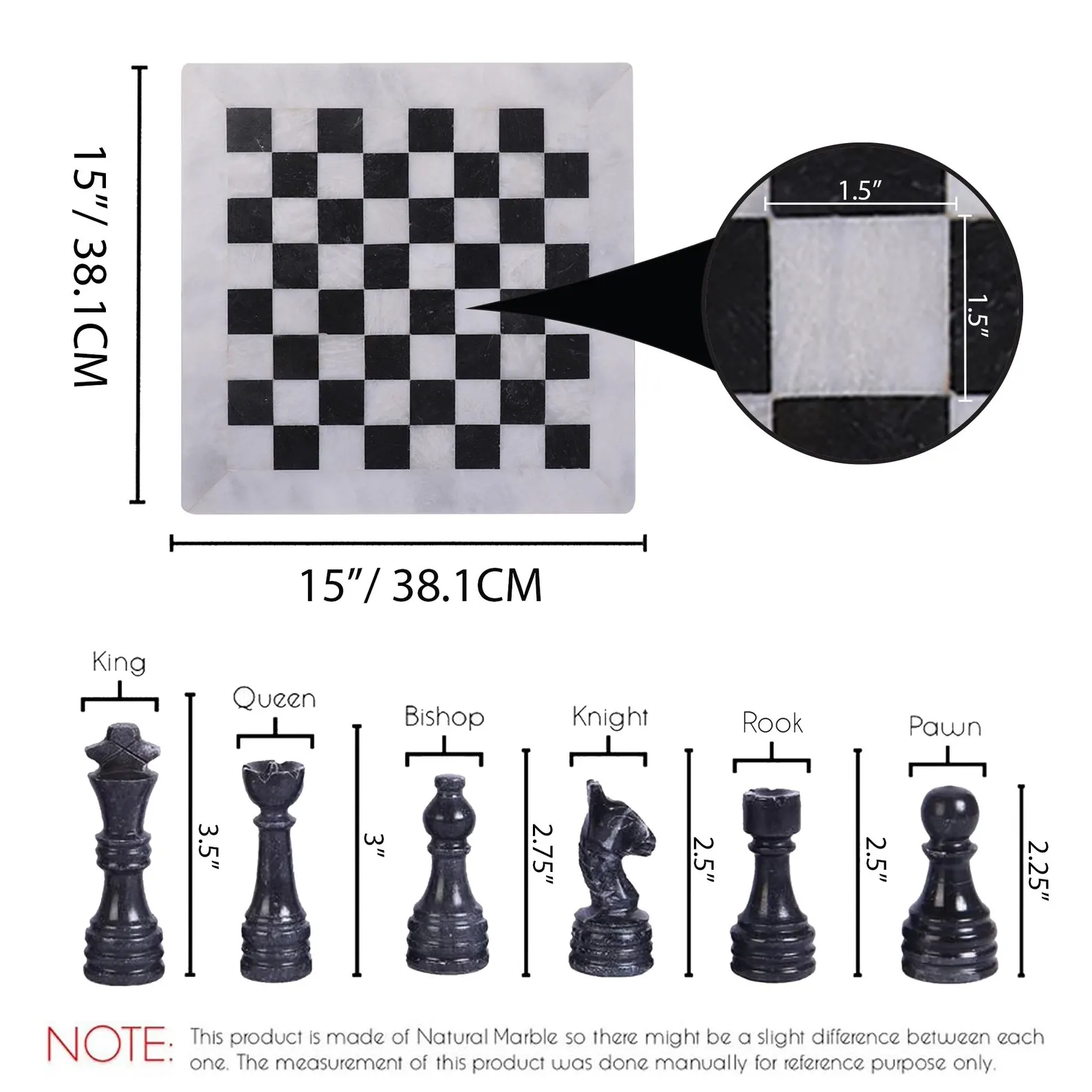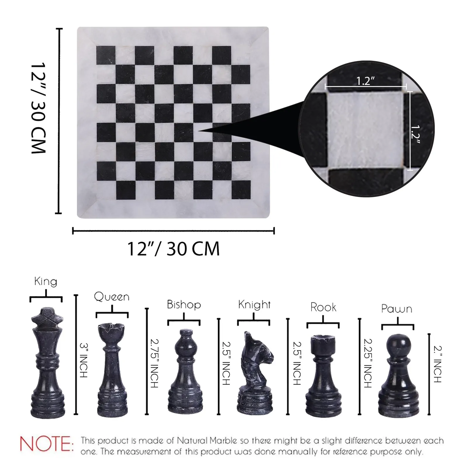 King height typically 7–10 cm (matched to board size)