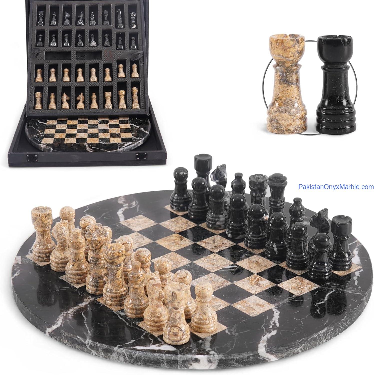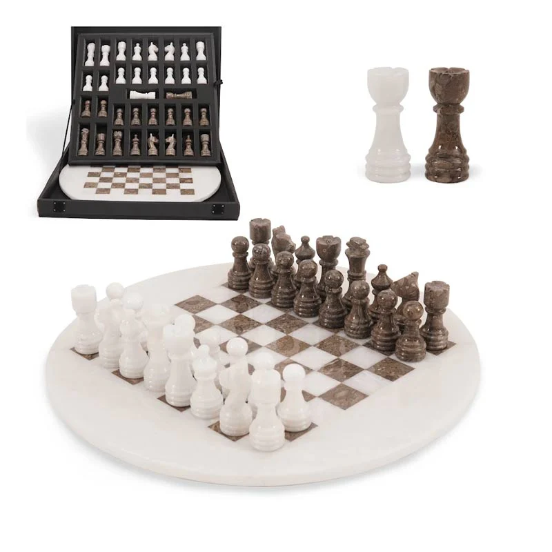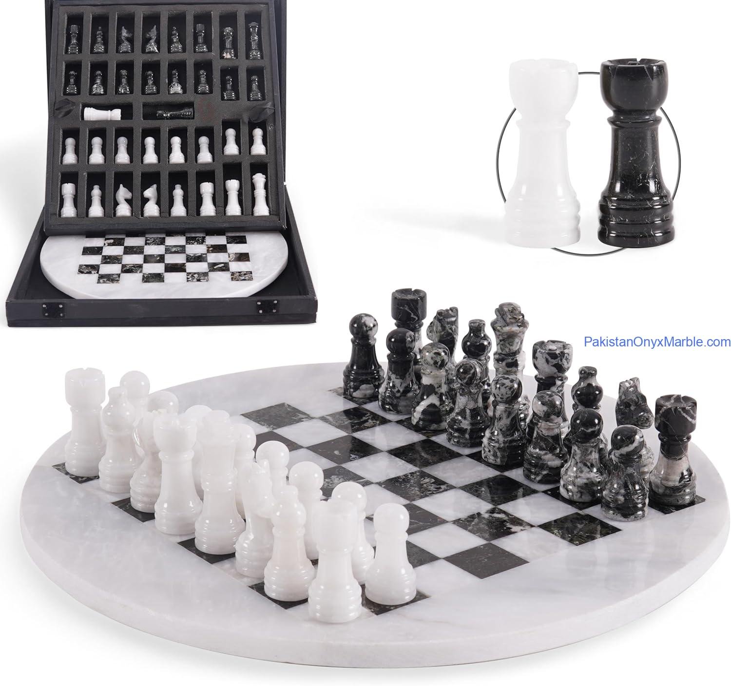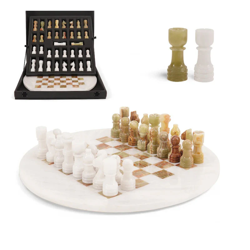 All Marble & Onyx Chess Set Round Boards are handcrafted luxury stone chess sets manufactured in Pakistan for international wholesale and export markets. Designed in a circular format instead of the traditional square board, these round chess sets offer a modern, decorative, and distinctive appearance while remaining fully functional for gameplay.