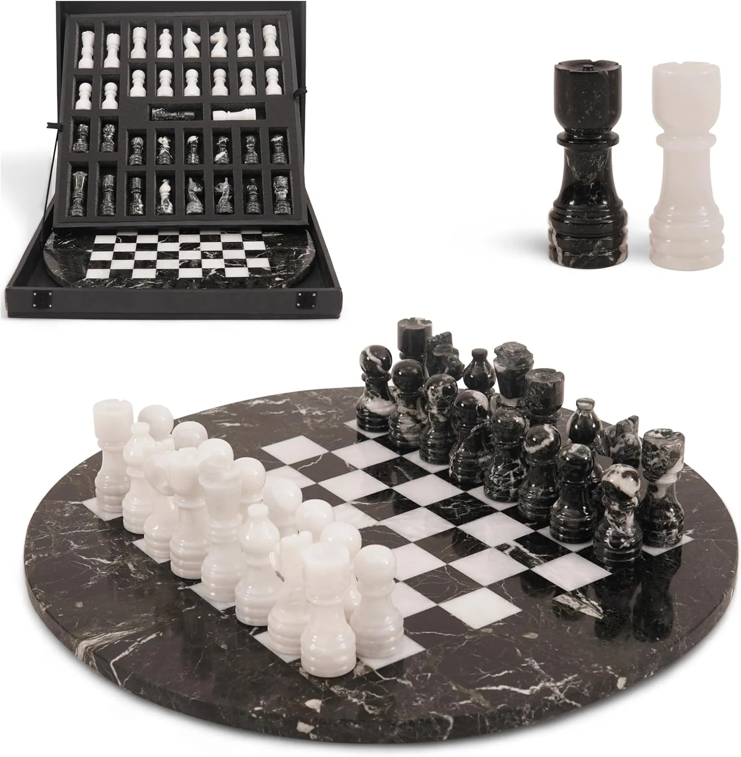 Made from 100% natural marble and onyx stone, each set includes a solid circular board paired with hand-carved stone chess pieces. The natural veining and color variations make every chess set unique.