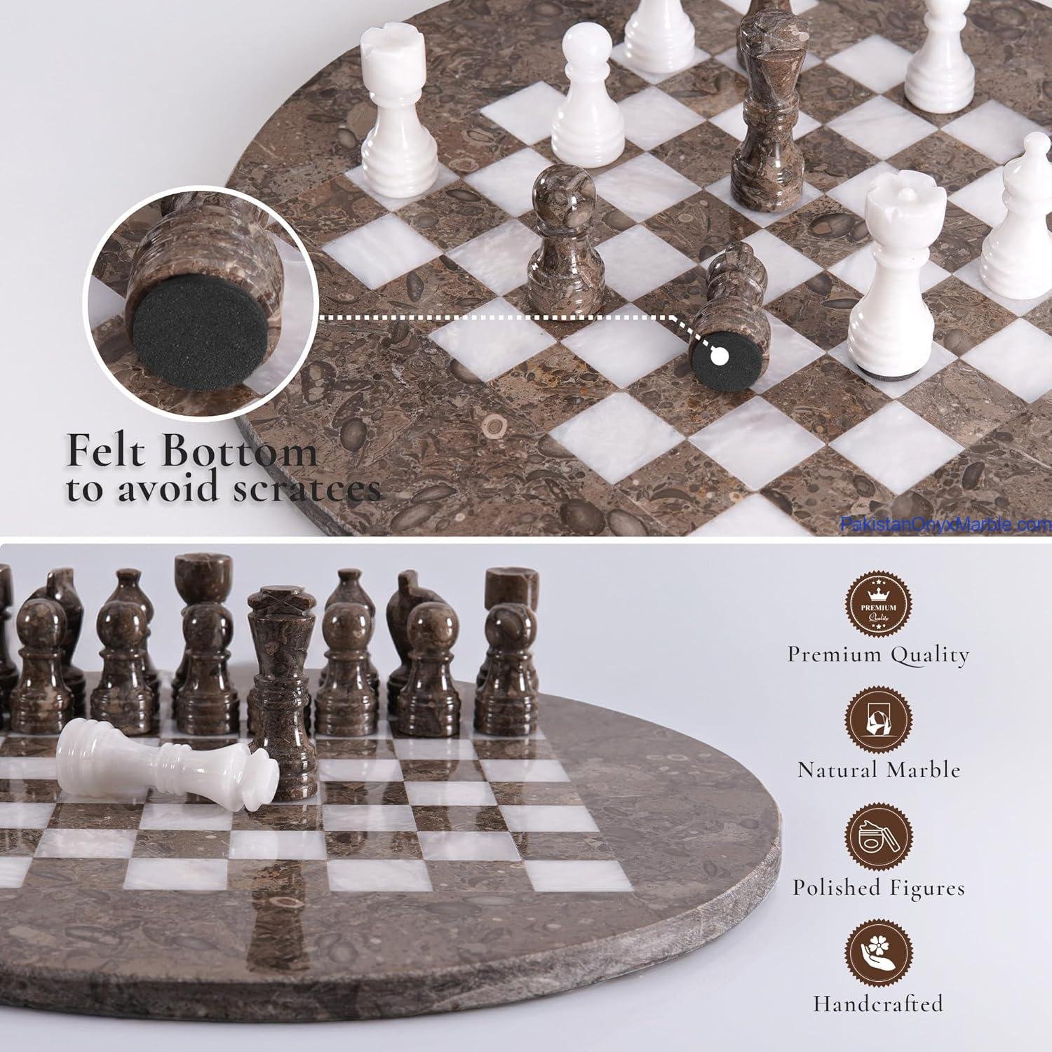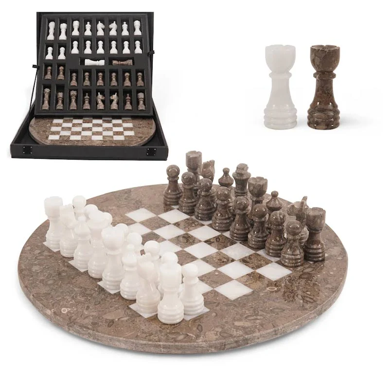 Marble Chess Set Round Board: Oceanic Fossil Marble & White Marble Handmade Luxury Board & Pieces