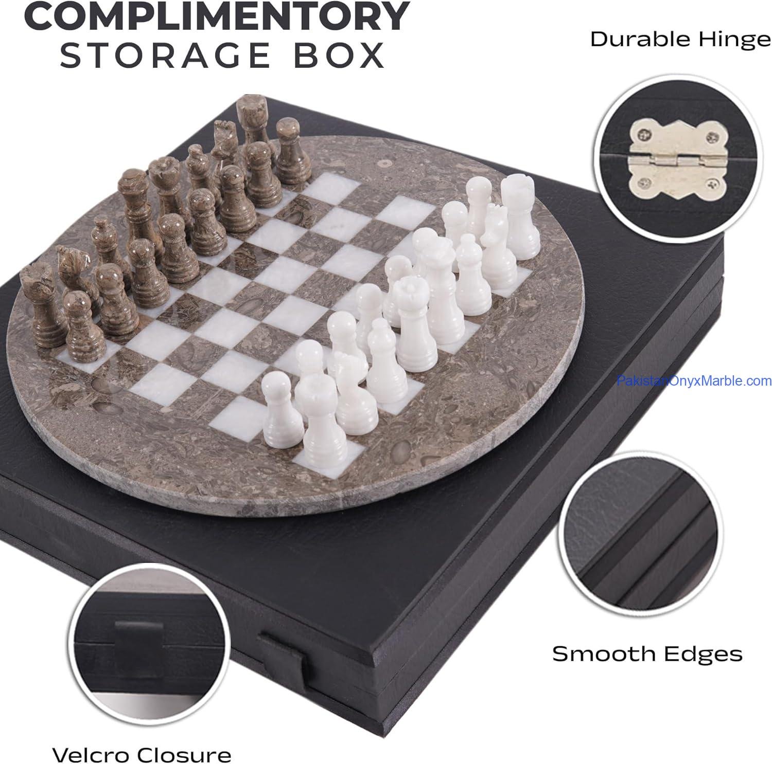 Marble Chess Set Round Board: Oceanic Fossil Marble & White Marble Handmade Luxury Board & Pieces Photo Gallery