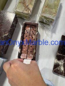 Marble domino pieces are supplied with a high polished finish, which enhances the stone’s natural color depth and smooth texture. Polishing also improves durability and comfort during gameplay.