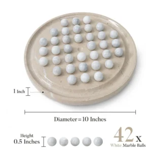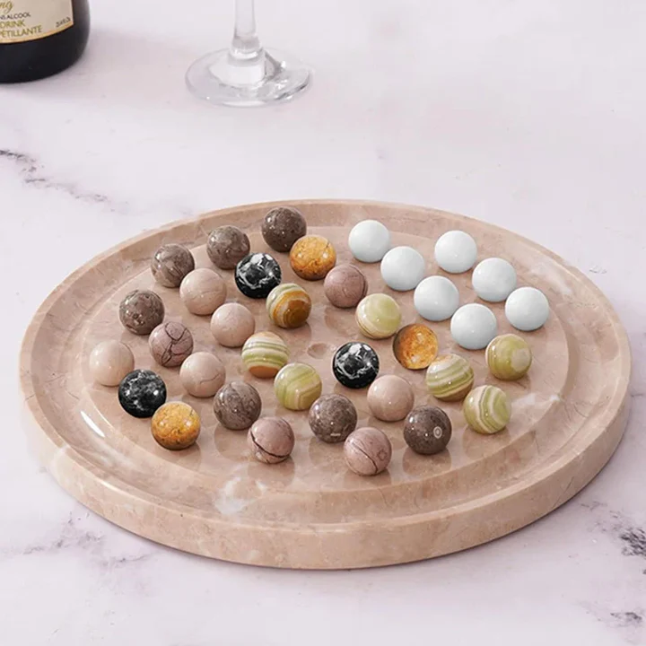 Each marble solitaire set typically consists of a solid marble board with precision-drilled holes and polished marble playing pieces (pegs or marbles). Due to the natural nature of marble, every board displays unique veins and color patterns, making each set visually distinctive.