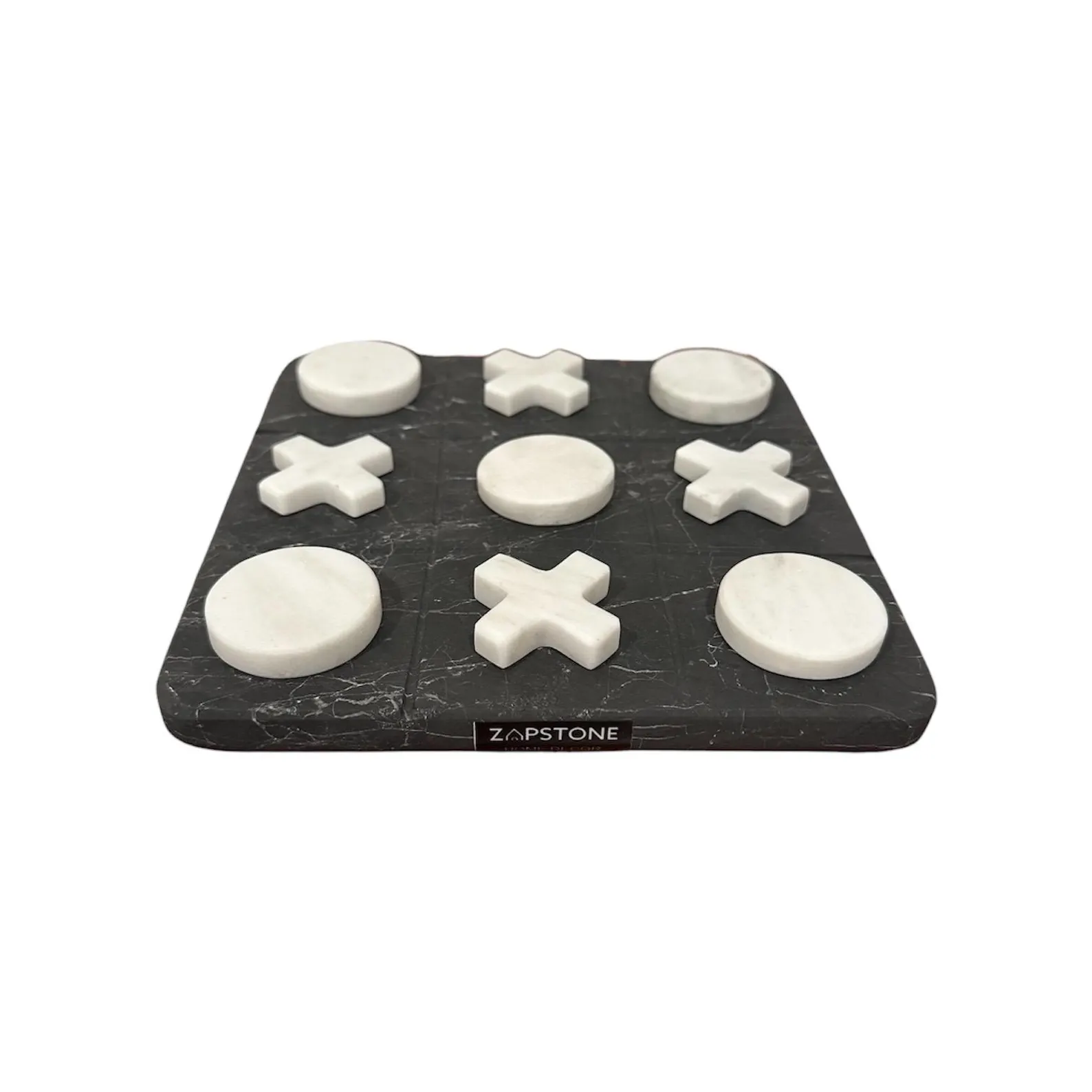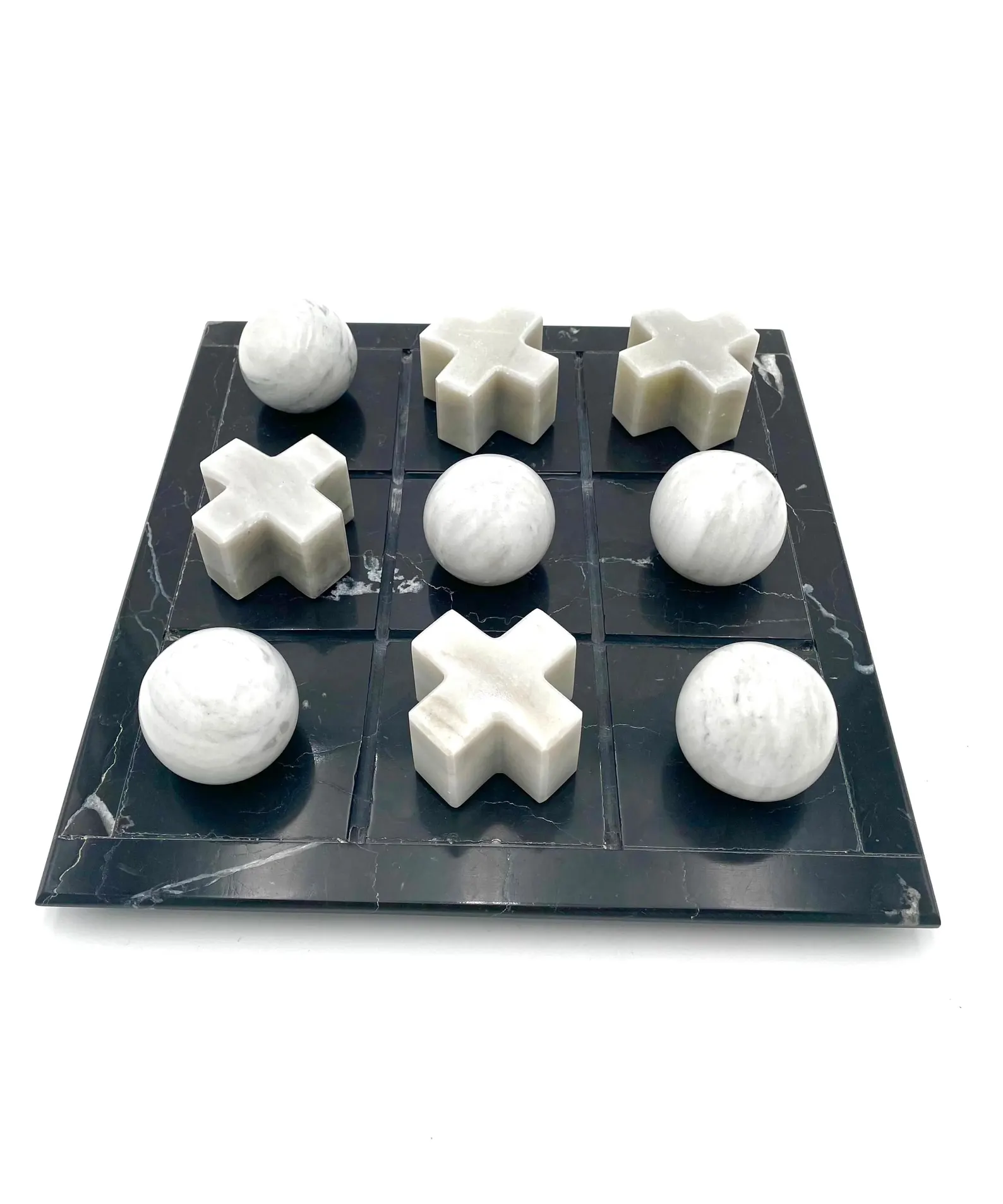 Each tic tac toe set includes a solid marble board with engraved or inlaid grid lines along with matching marble playing pieces (X and O or disc-style markers). The natural veining and color variation of marble ensure every set is unique.