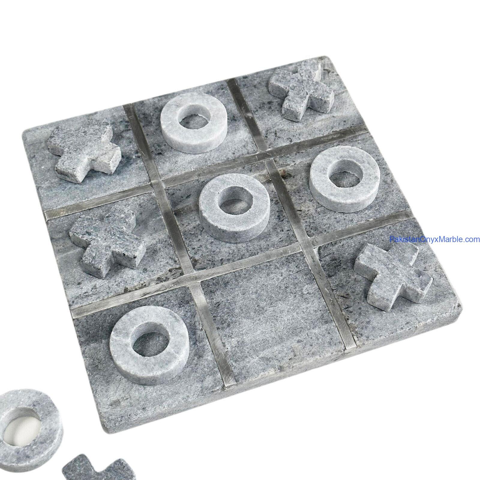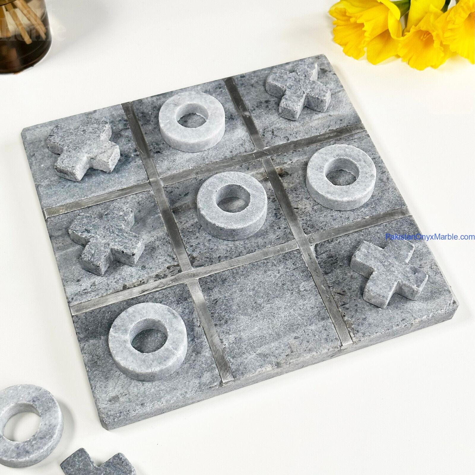 Each tic tac toe set includes a solid marble board with engraved or inlaid grid lines along with matching marble playing pieces (X and O or disc-style markers). The natural veining and color variation of marble ensure every set is unique.