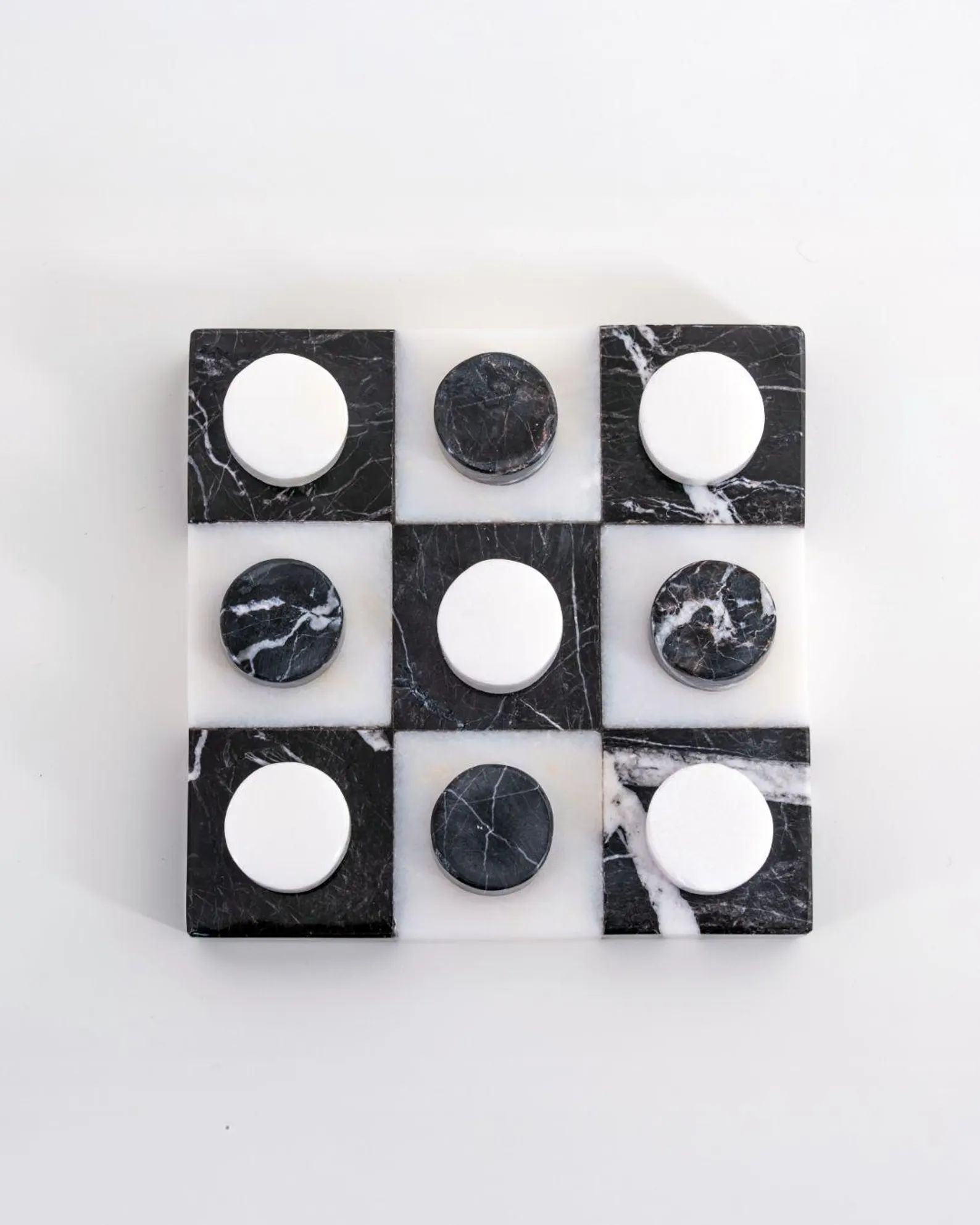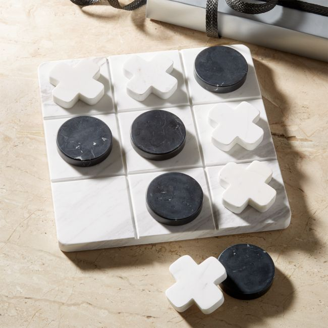 Each tic tac toe set includes a solid marble board with engraved or inlaid grid lines along with matching marble playing pieces (X and O or disc-style markers). The natural veining and color variation of marble ensure every set is unique.