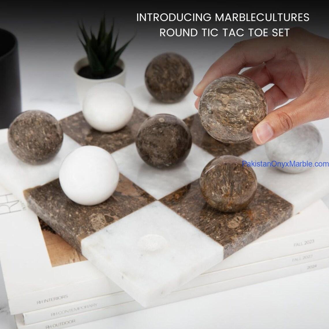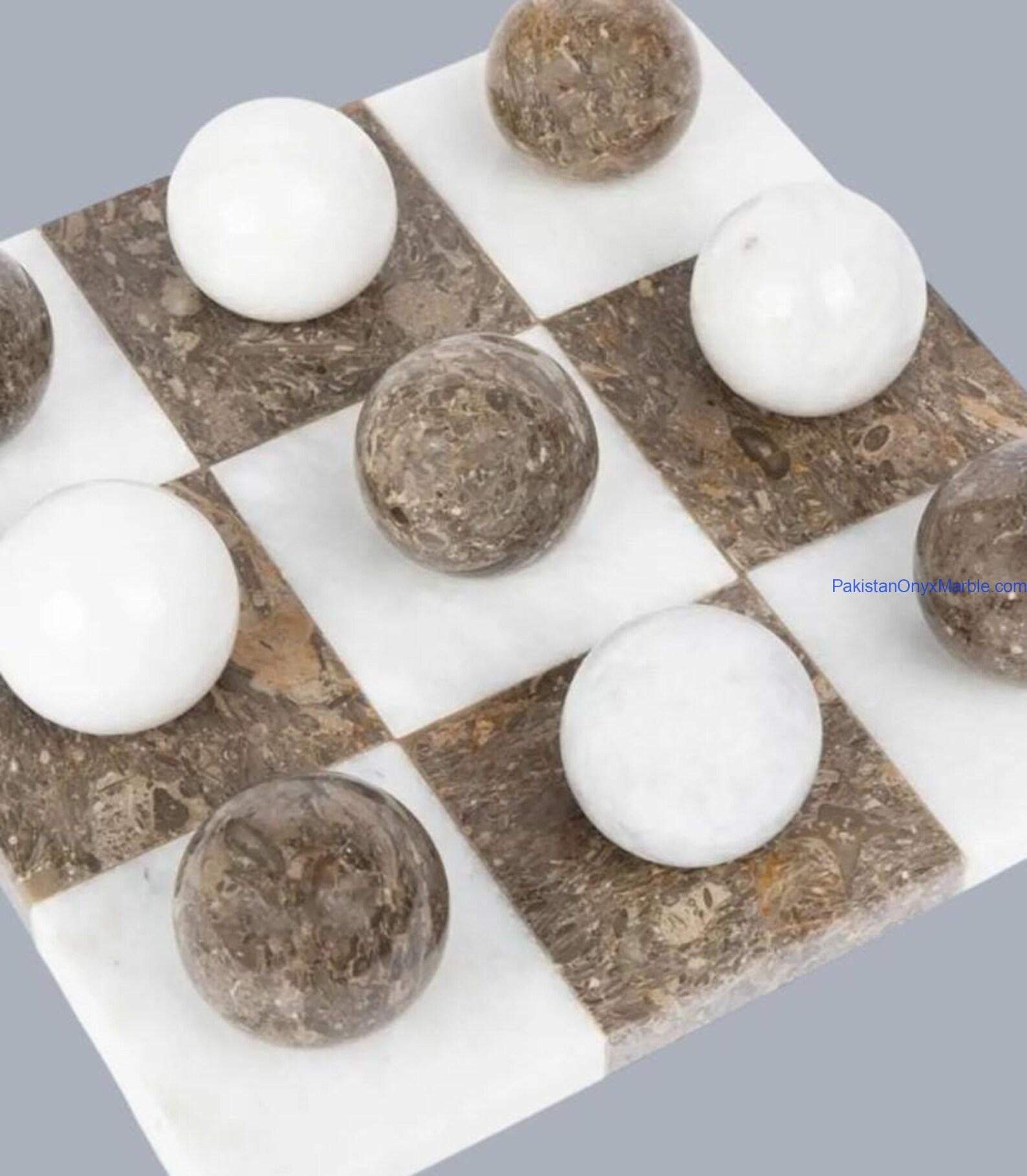 Each tic tac toe set includes a solid marble board with engraved or inlaid grid lines along with matching marble playing pieces (X and O or disc-style markers). The natural veining and color variation of marble ensure every set is unique.