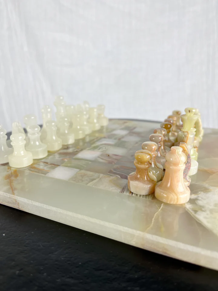 All Onyx Chess Sets and Boards & Pieces are handcrafted luxury stone products made from 100% natural onyx marble, manufactured in Pakistan for global wholesale and export markets. Each set includes a solid onyx chess board and hand-carved stone chess pieces, designed to function as both a playable board game and a high-end decorative item. These products are positioned for premium buyers who value natural materials, craftsmanship, and durability rather than mass-produced uniformity.