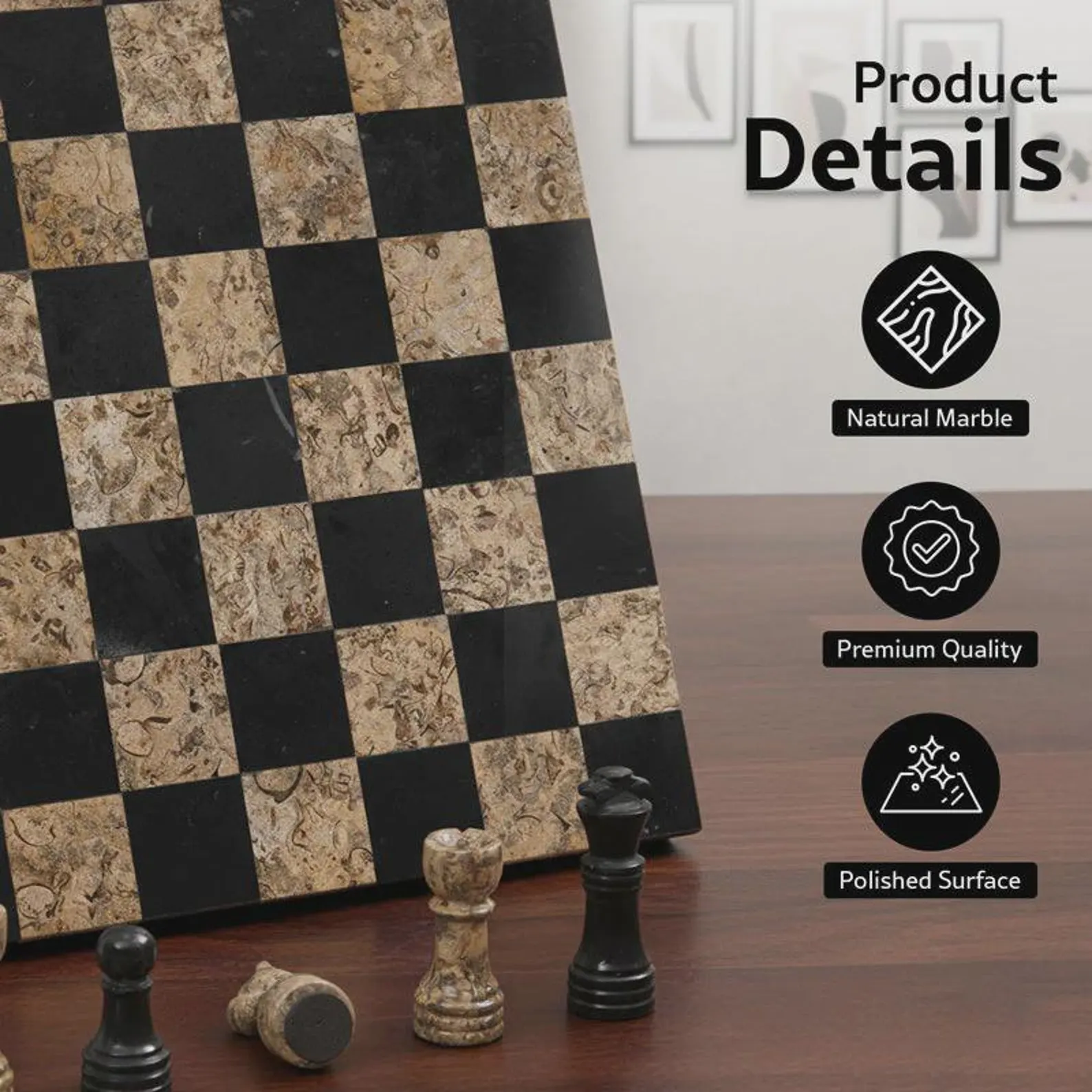 Onyx Chess Set Border Less: Black Marble & Fossil Coral Marble Handmade Luxury Board & Pieces Photo Gallery