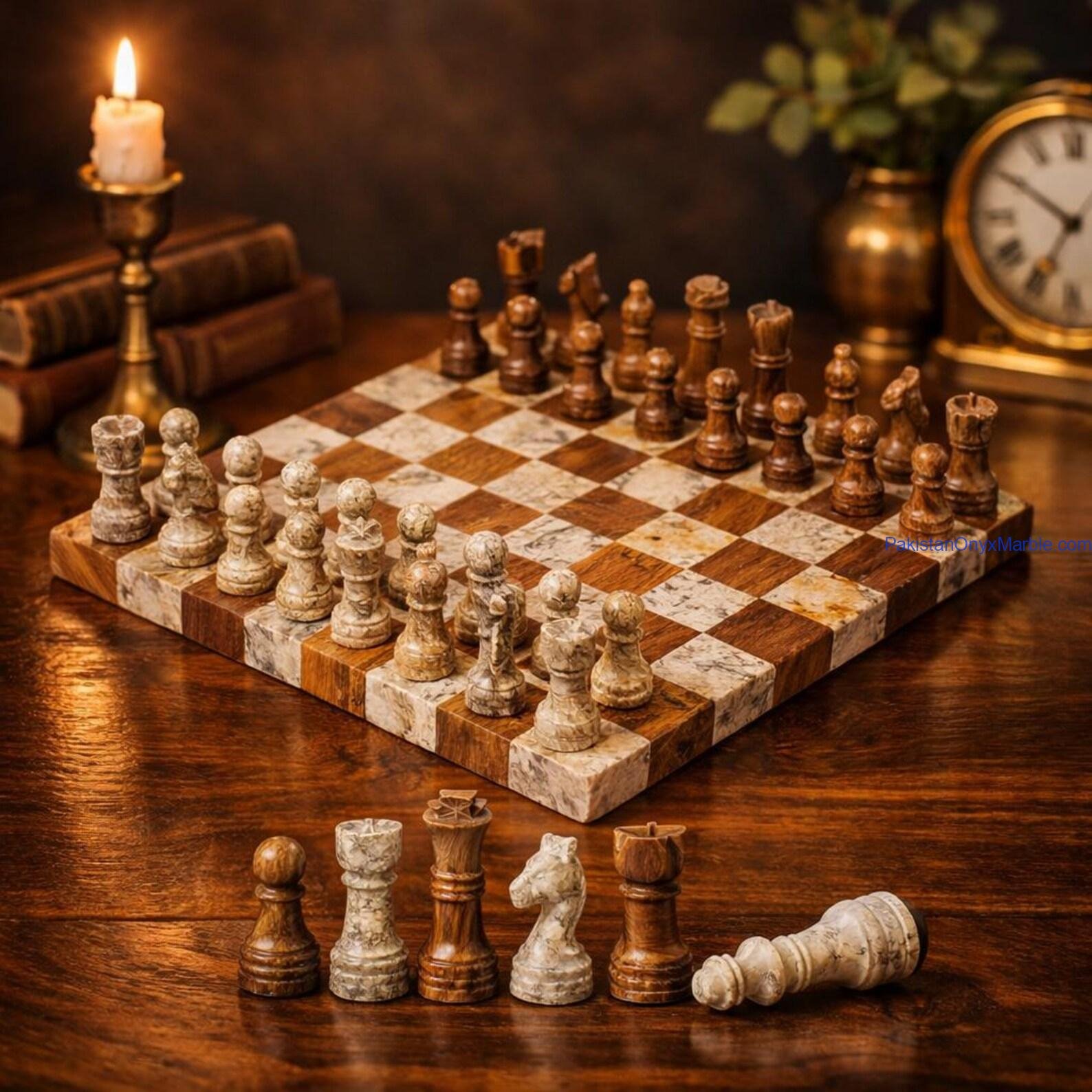 All Onyx Chess Sets and Boards & Pieces are handcrafted luxury stone products made from 100% natural onyx marble, manufactured in Pakistan for global wholesale and export markets. Each set includes a solid onyx chess board and hand-carved stone chess pieces, designed to function as both a playable board game and a high-end decorative item. These products are positioned for premium buyers who value natural materials, craftsmanship, and durability rather than mass-produced uniformity.