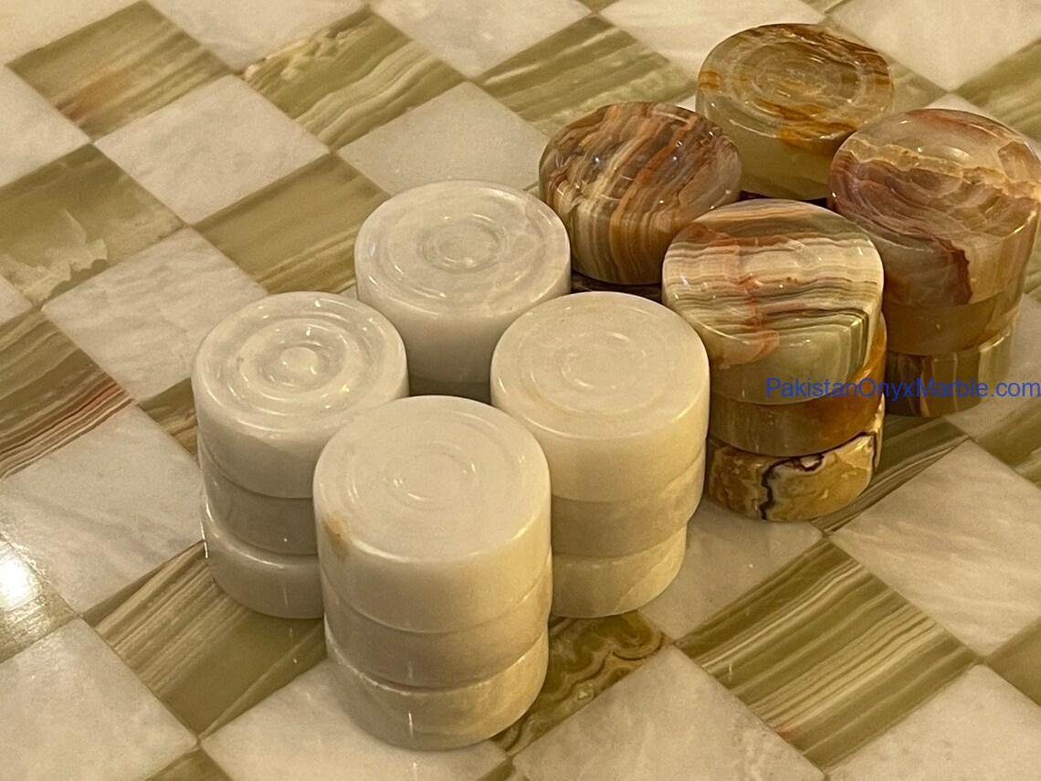 Onyx marble is valued for its natural translucency, layered patterns, and rich colors, making each checker set visually unique and suitable for both gameplay and luxury décor.