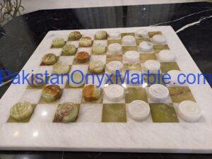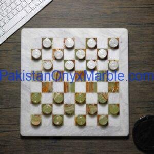 Checker sets are manufactured using natural marble, onyx, and travertine stone sourced from Pakistan’s stone quarries. These materials are widely valued for their durability, natural patterns, and premium aesthetic.