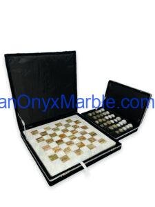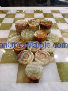 Onyx marble is valued for its natural translucency, layered patterns, and rich colors, making each checker set visually unique and suitable for both gameplay and luxury décor.