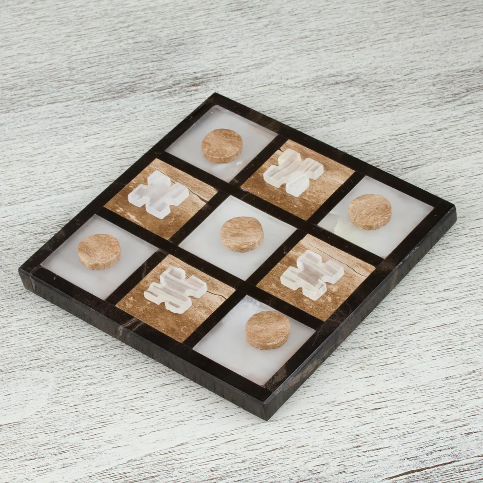 Each tic tac toe set includes a solid onyx board with engraved or inlaid grid lines along with matching onyx playing pieces. The natural translucency and layered patterns of onyx make every set unique.