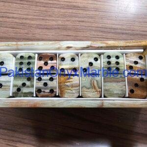 All domino tiles are made from natural onyx stone, sourced from Pakistan’s stone quarries. The stone is selected for its strength, translucent quality, and decorative natural patterns.