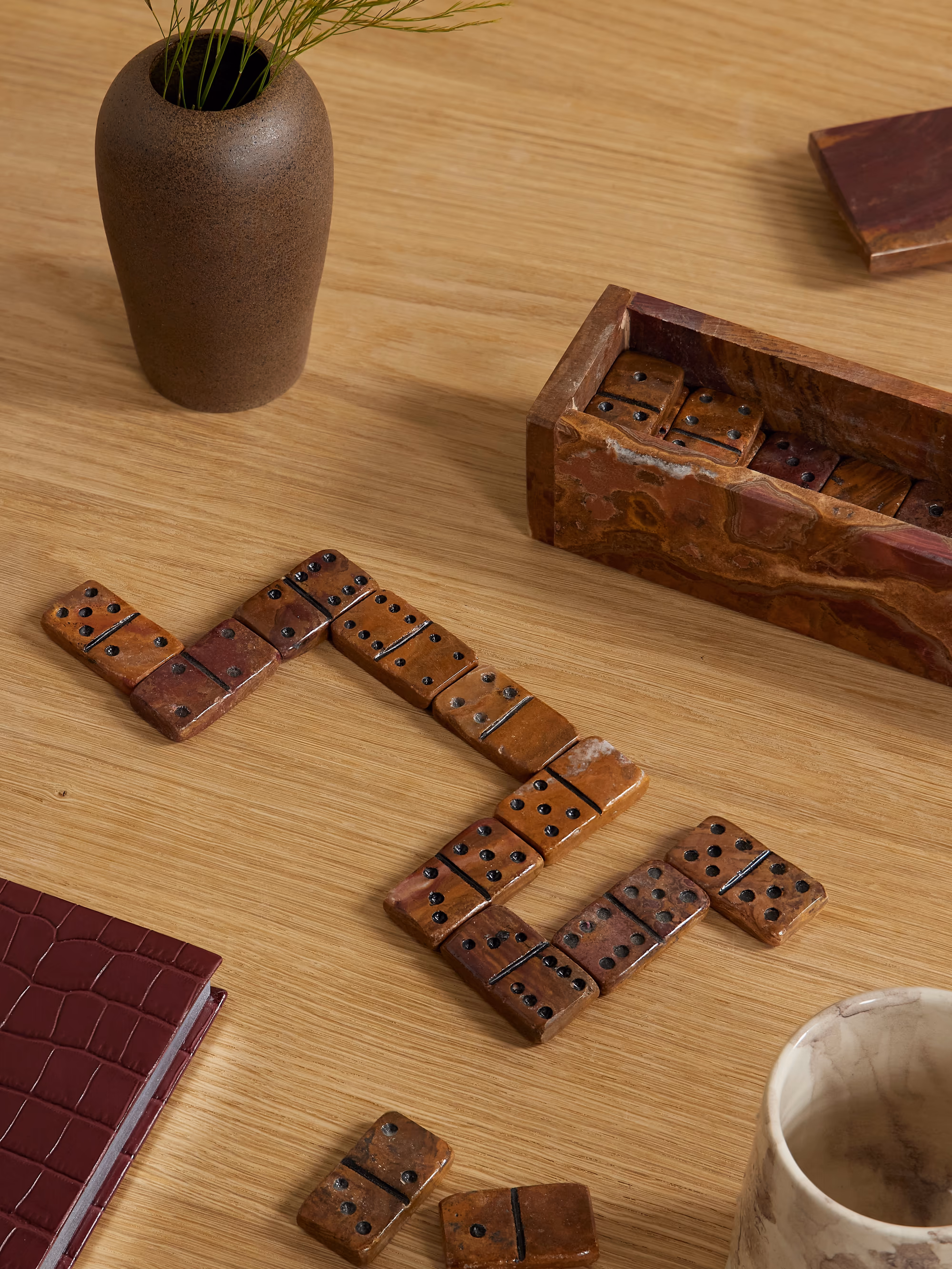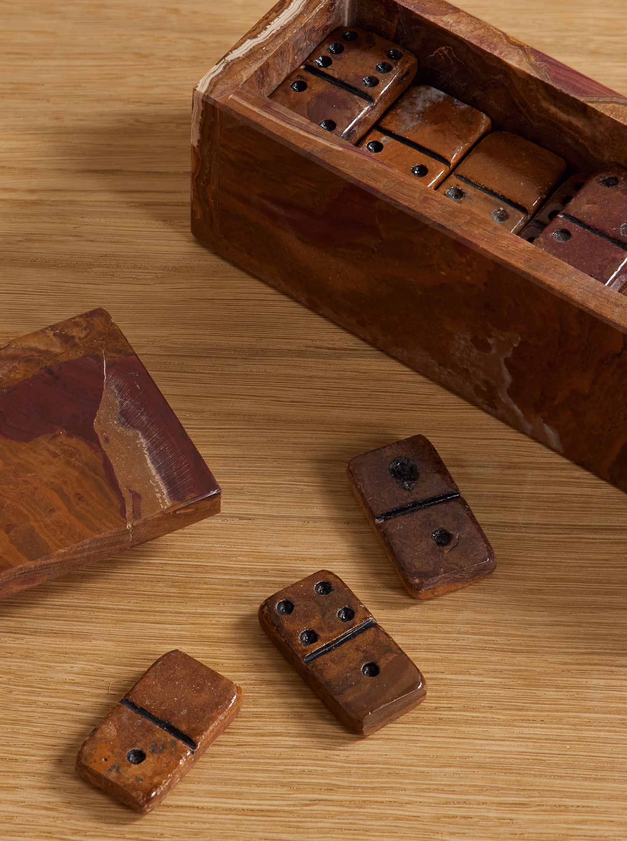 Onyx domino tiles are supplied with a polished finish, enhancing the stone’s natural depth and color contrast while creating a smooth playing surface.
