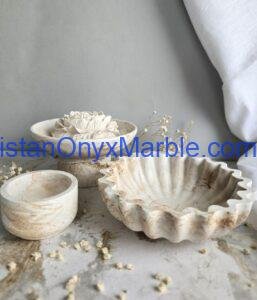 Beige marble round scalloped bowls feature elegantly curved, petal-like edges, adding a soft yet sophisticated look to any space. Their combination of smooth marble and intricate scalloped detailing makes them perfect for both functional and decorative purposes.