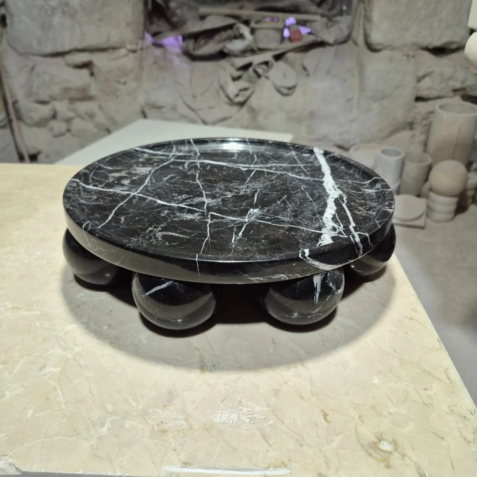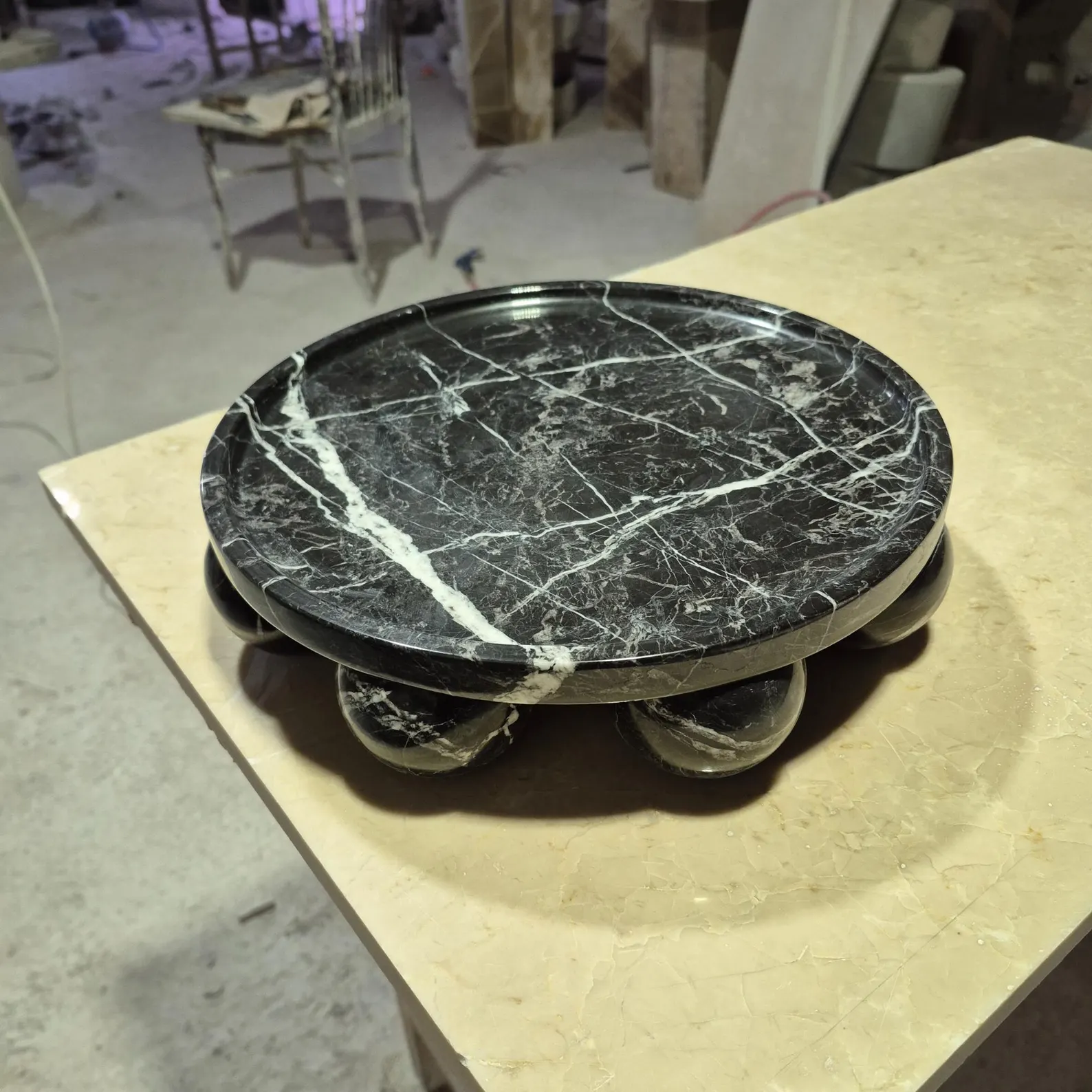 Black zebra marble trays round with sphere base designs, round black zebra marble tray with ball feet, black zebra marble serving tray sphere base, luxury black zebra marble tray with round sphere legs, marble tray round sphere base zebra marble, decorative black zebra marble tray, coffee table black zebra marble round tray ball base, bathroom vanity black zebra marble tray sphere feet, hotel spa black zebra marble serving tray, wholesale black zebra marble trays, black zebra marble tray manufacturer Pakistan, marble tray exporter Pakistan
