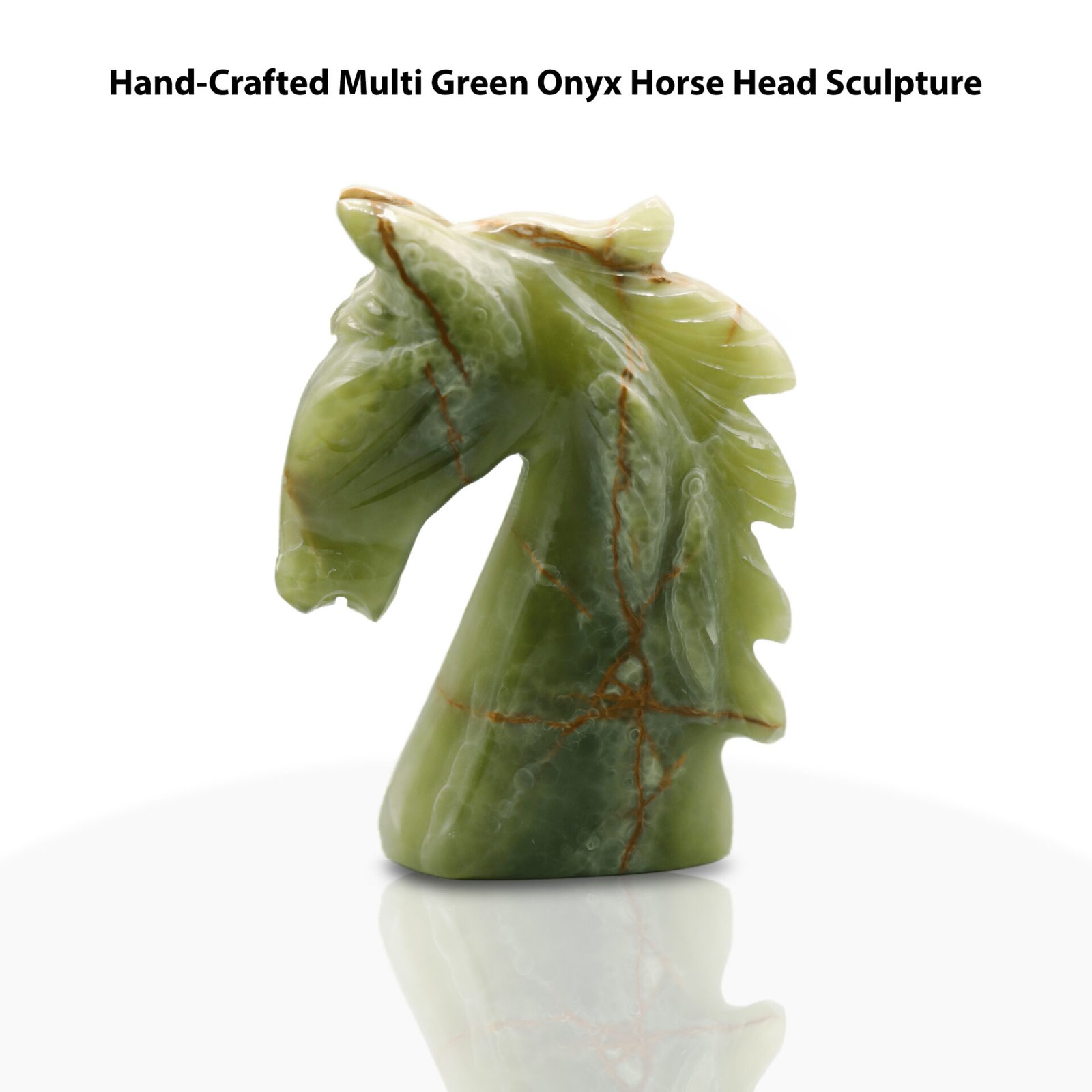 Each horse head sculpture is carved from solid onyx and hand-polished, resulting in unique natural veining, translucency, and individuality in every piece.