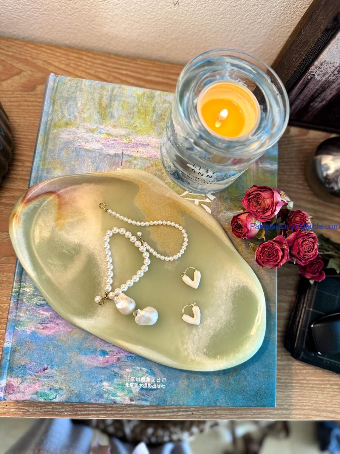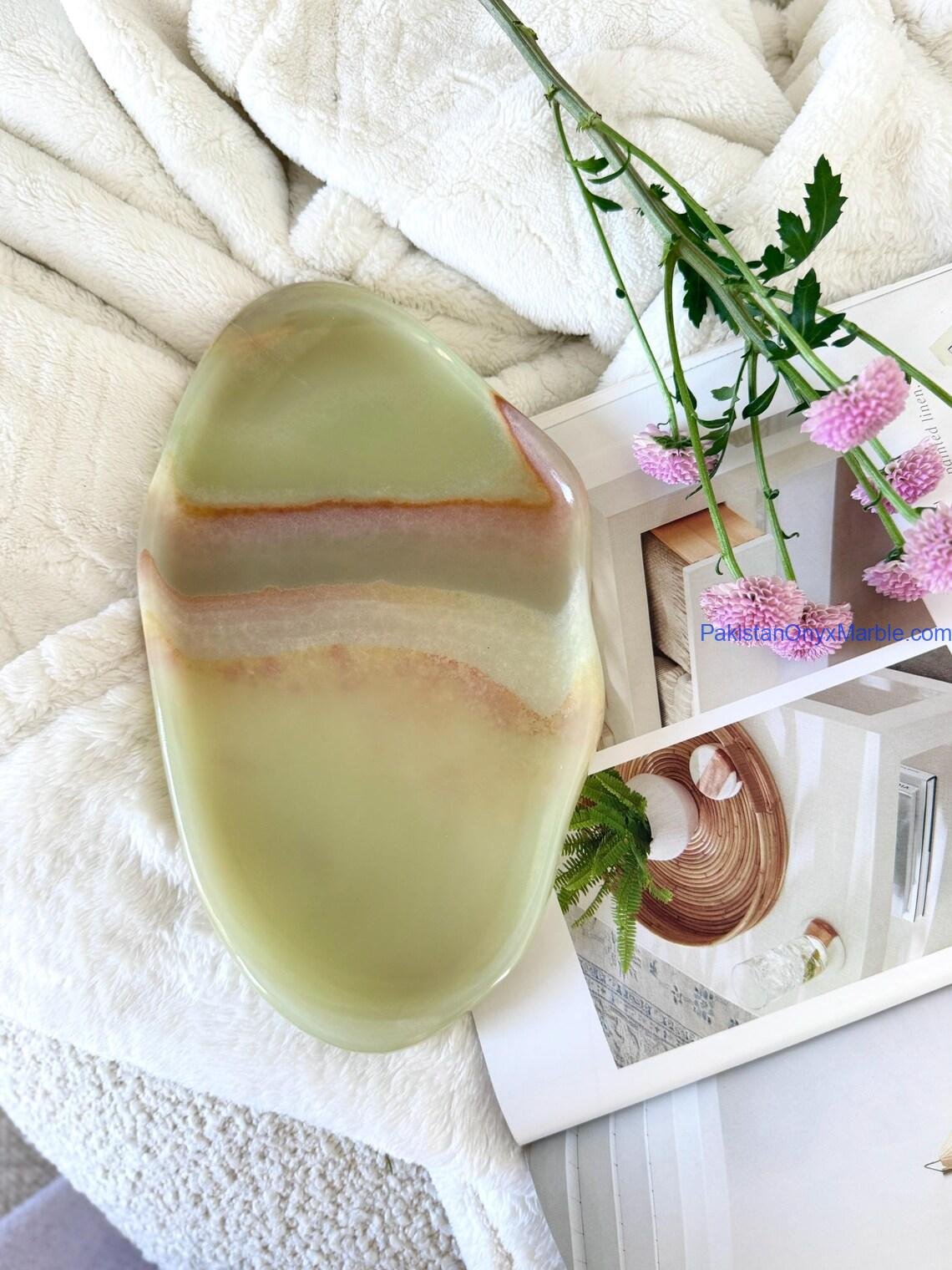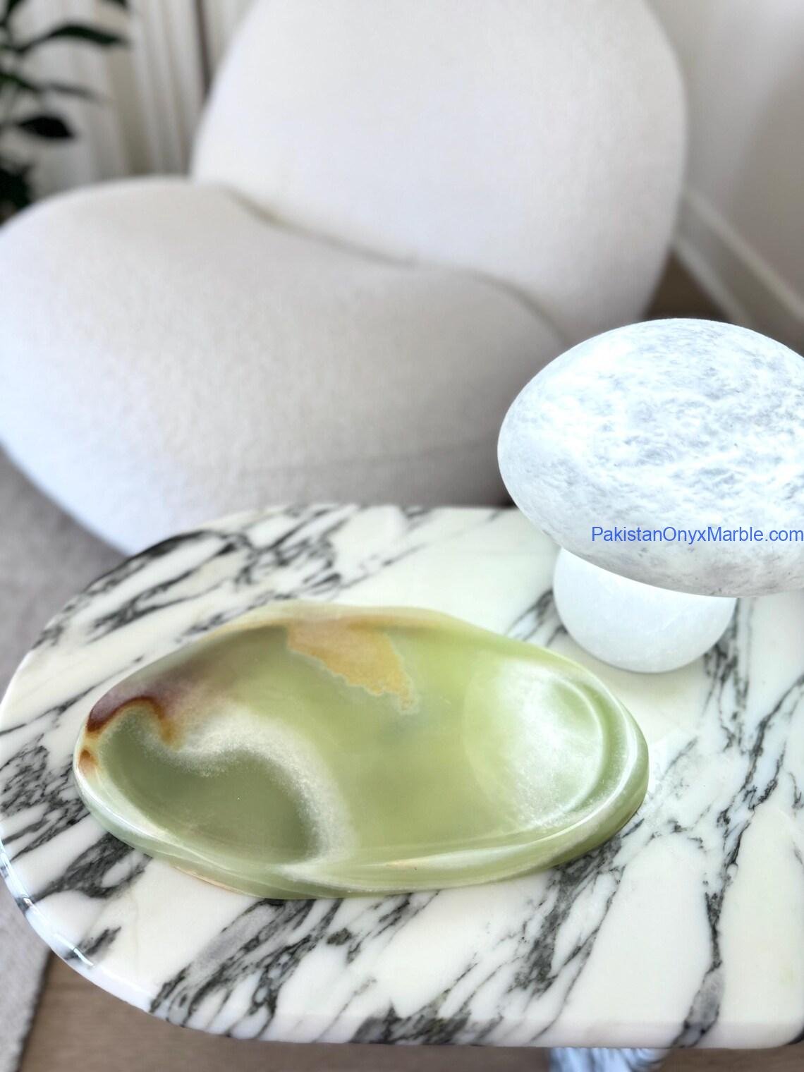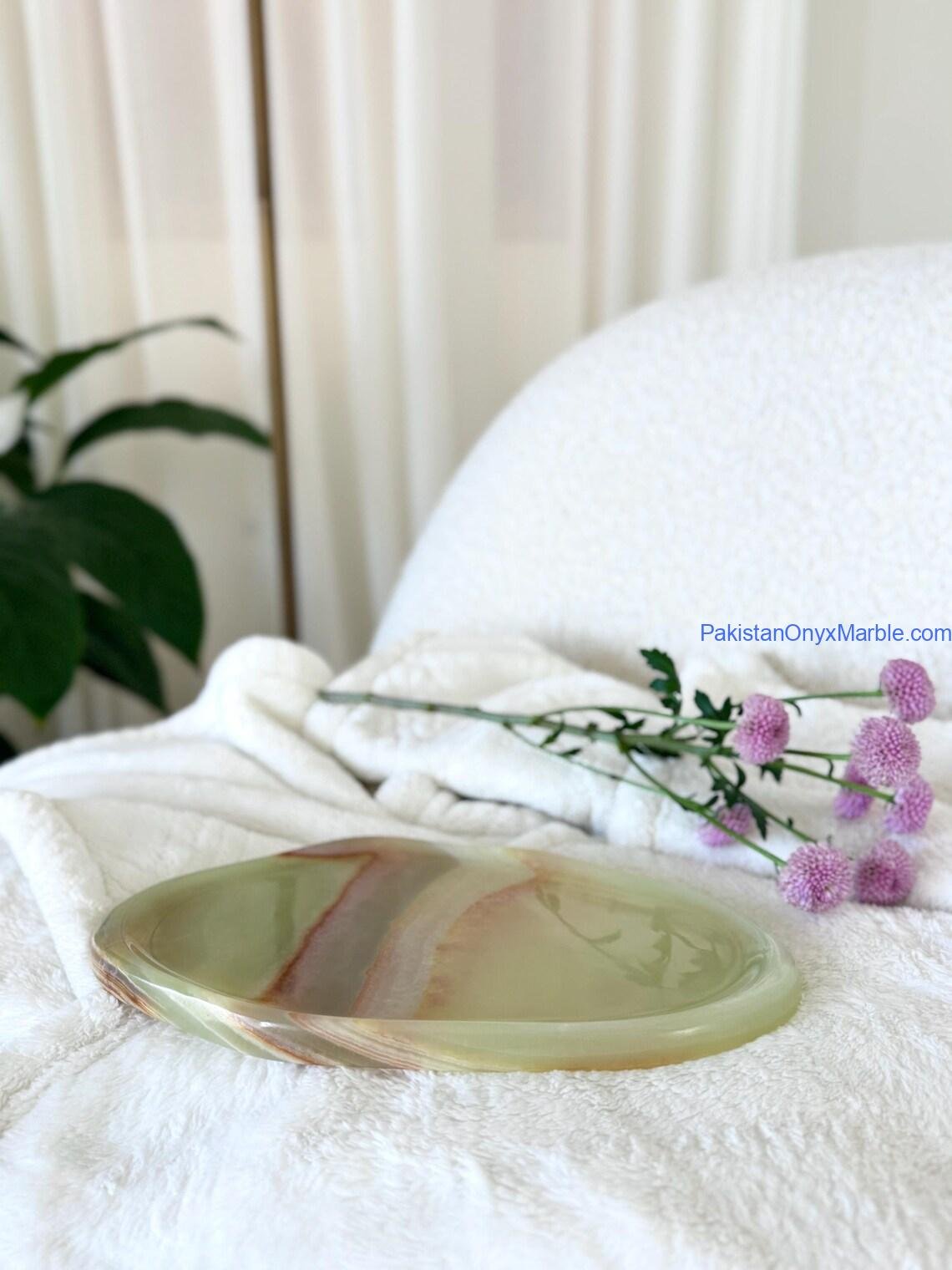 Pakistan Onyx Marble manufactures premium Afghan Green Jade Onyx Irregular Trays, expertly carved from Grade-A Green Jade Onyx sourced directly from Afghanistan. Each piece is shaped from a single solid block, preserving the natural veins, rich green tones, and authentic organic contours of the stone. The irregular design follows the natural outline of the slab, giving every tray a unique, sculptural appearance suitable for luxury home décor, serving, retail display, and interior design projects.