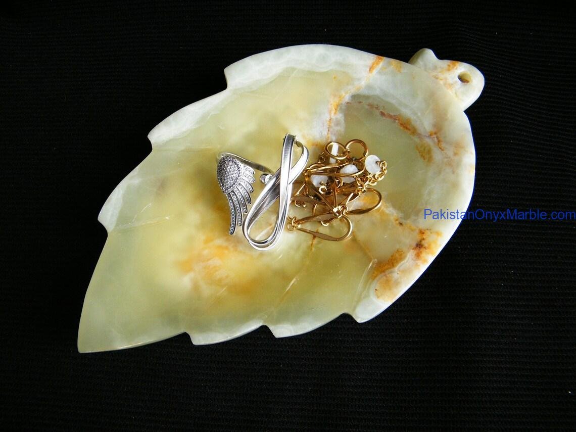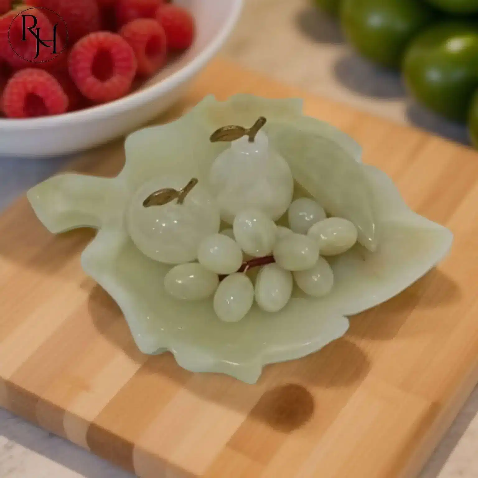 Pakistan Onyx Marble manufactures premium Afghan Green Jade Onyx Leaf Trays, carved from Grade-A Green Jade Onyx sourced directly from Afghanistan. Each tray is made from a single solid block, ensuring natural translucency, rich green tonal depth, and exceptional durability. The leaf-shaped design features a tapered body, smooth curved edges, and optional carved vein details, giving every tray a sculptural, elegant, and high-end appearance suitable for luxury décor, serving, and interior styling.