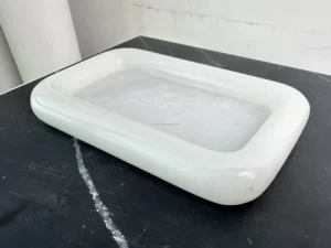 Pakistan Onyx Marble manufactures premium Afghan Snow White Onyx Bubble Rectangle Trays, crafted from Grade-A white onyx sourced from Afghanistan. Each tray is hand-carved from a single solid block and features a smooth rectangular center with raised bubble-like rounded edges, creating a modern sculptural profile. The polished finish, clean white tone, and distinctive bubble border make this design suitable for luxury décor, serving, and interior styling projects.