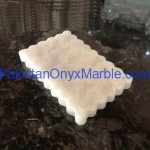 Pakistan Onyx Marble manufactures premium Afghan Snow White Onyx Scalloped Rectangle Trays, hand-carved from Grade-A white onyx sourced directly from Afghanistan. Each tray is cut from a single solid block and features a rectangular profile with elegant scalloped edges, creating a refined sculptural look. The clean white color, polished finish, and decorative wavy border make this tray ideal for luxury home décor, kitchen serving, vanity organization, and boutique retail displays.