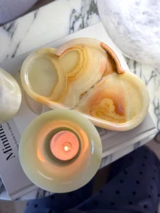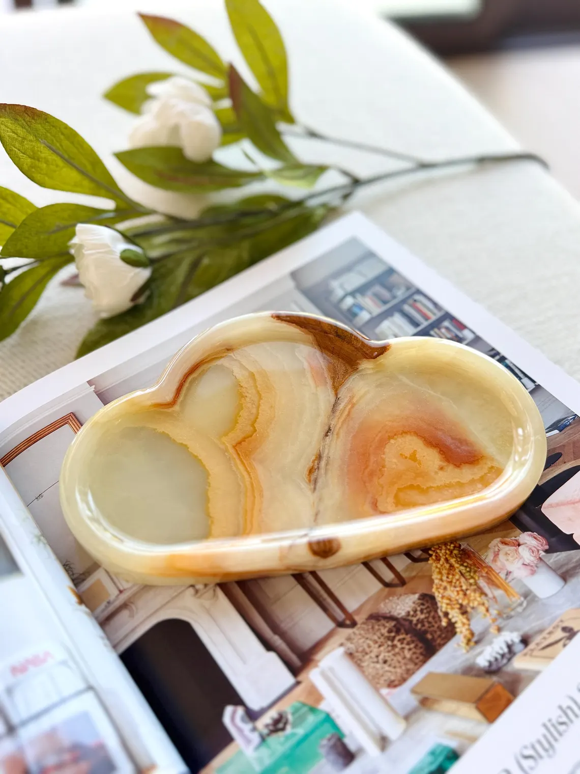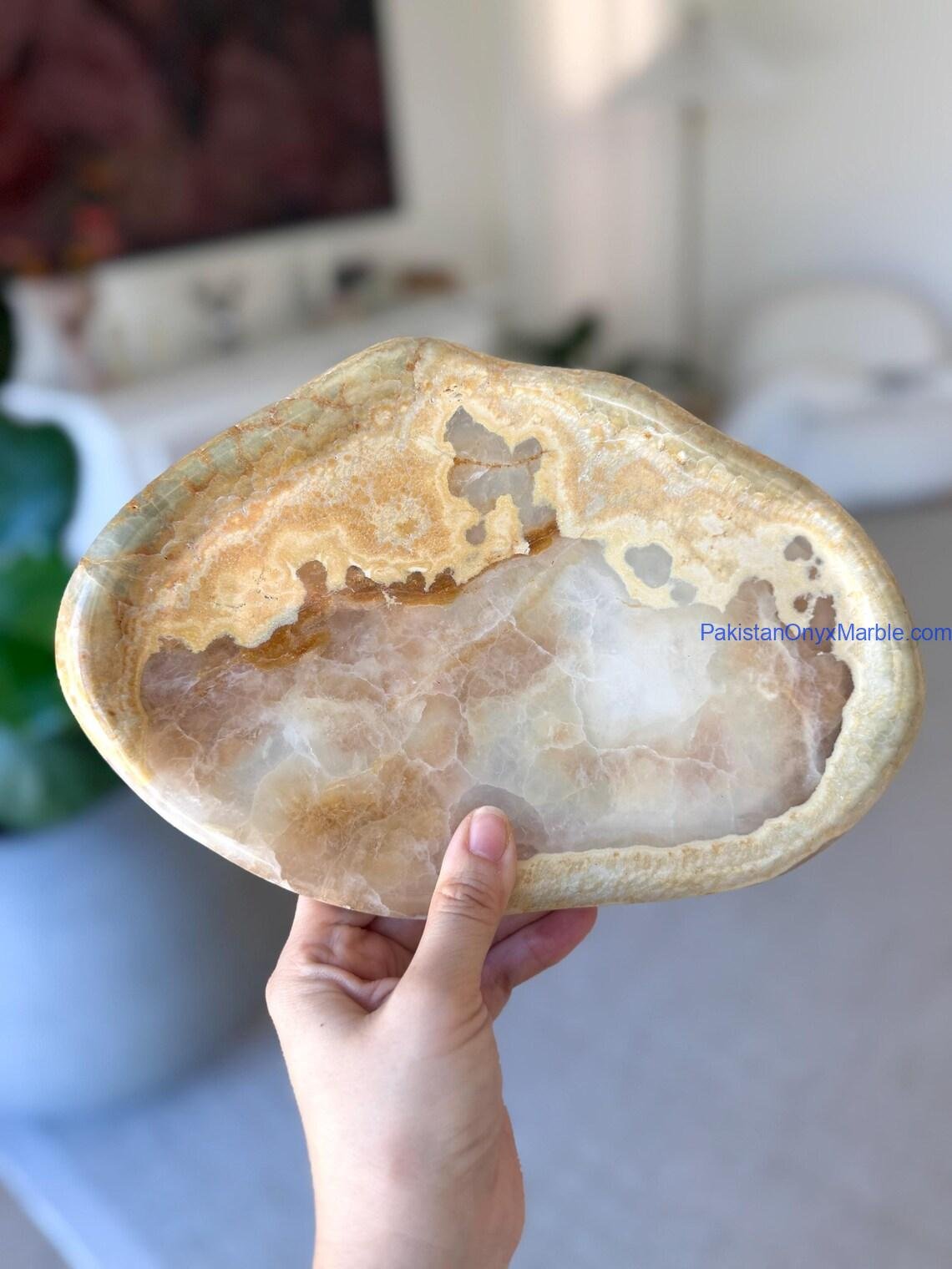 Pakistan Onyx Marble produces premium Light Green Onyx Irregular Trays, handcrafted from Grade-A Light Green Onyx sourced directly from Pakistan. Each tray is carved from a single solid block, following the natural outline of the stone to create an organic, freeform silhouette. The soft pastel-green tones, delicate veining, and gentle translucency make every tray uniquely artistic—perfect for luxury décor, serving, vanity styling, and boutique retail displays.