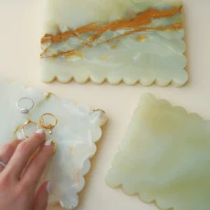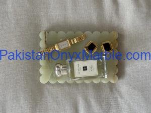 Pakistan Onyx Marble manufactures premium Green Onyx Scalloped Rectangle Trays crafted from Grade-A Green Onyx sourced directly from Pakistan. Each tray is carved from a single solid block, revealing the stone’s deep green tones, bold natural veining, and elegant translucent character. The rectangular body paired with beautifully carved scalloped edges creates a modern, luxurious, and decorative profile suitable for high-end home décor, serving, vanity setups, and boutique retail displays.