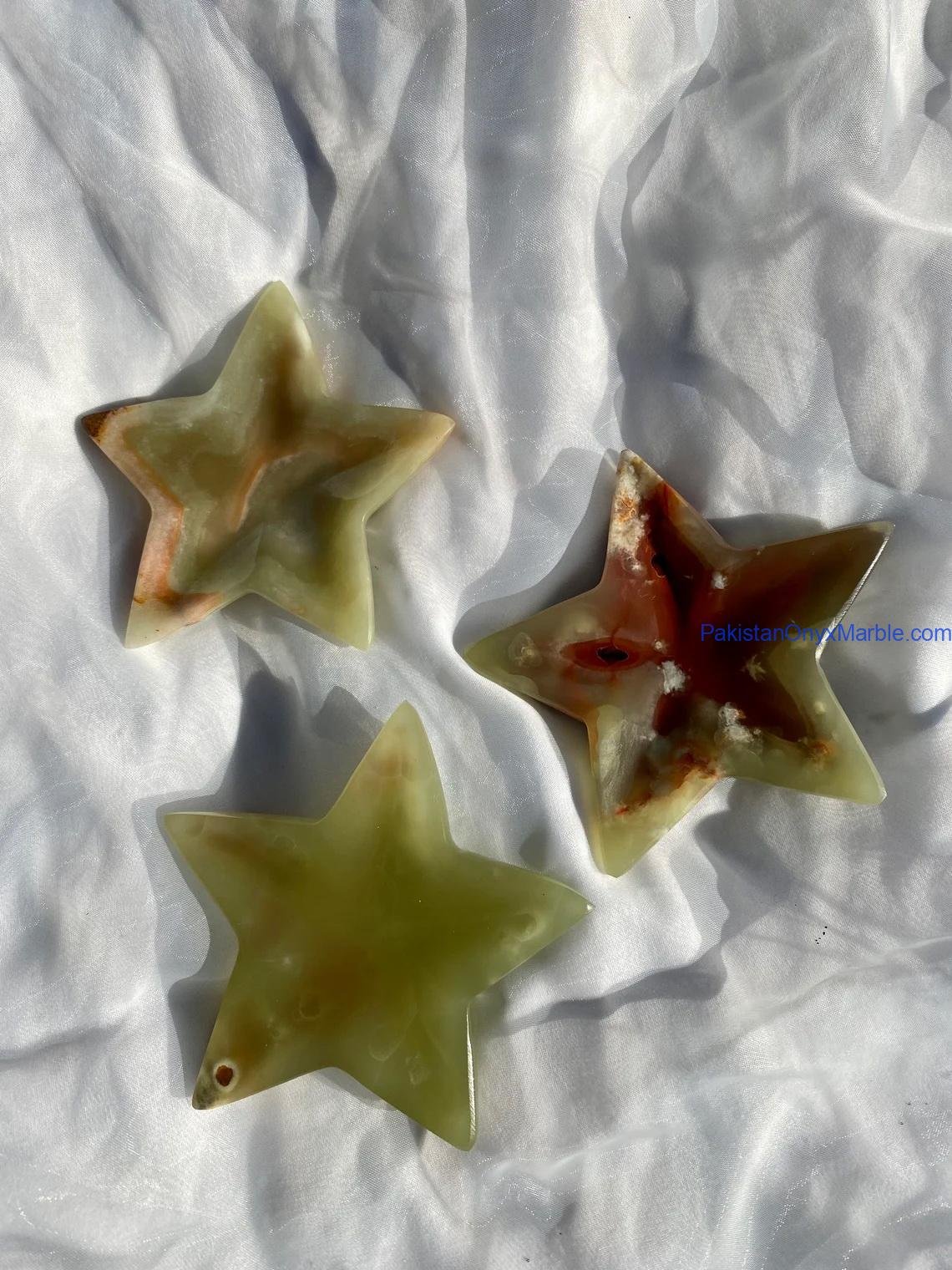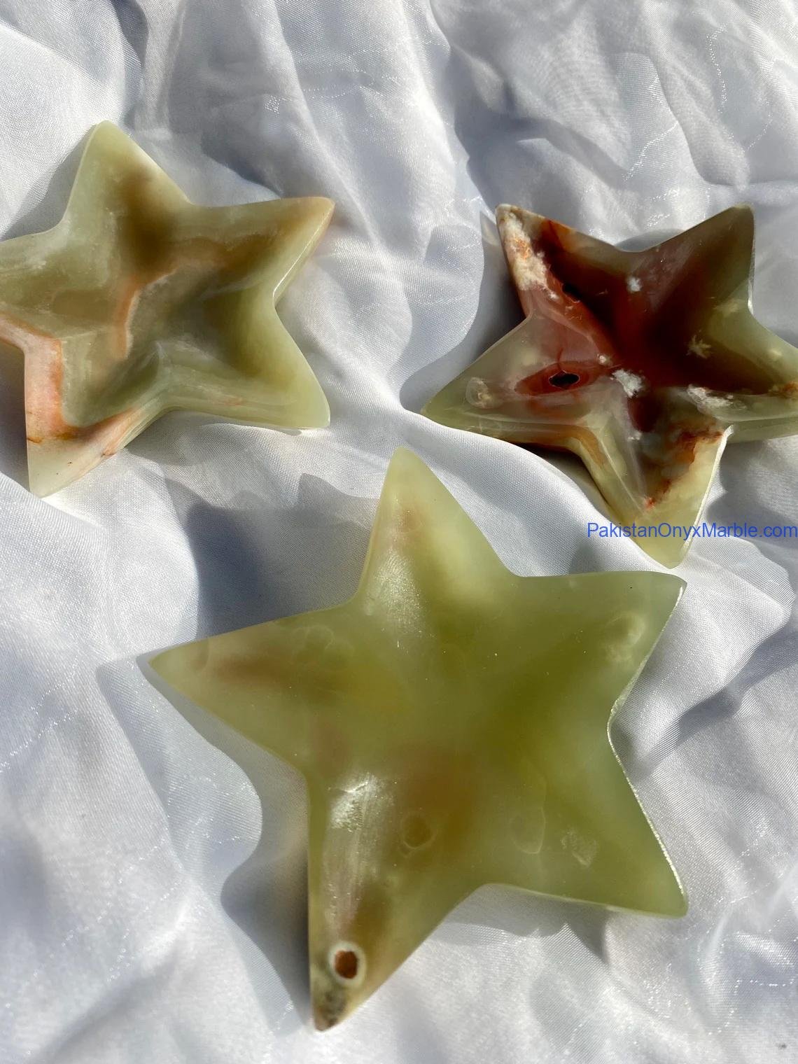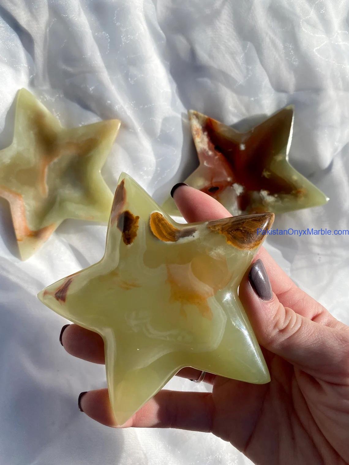 Pakistan Onyx Marble manufactures premium Green Onyx Star Trays carved from Grade-A Green Onyx sourced directly from Pakistan. Each tray is sculpted from a single solid block, ensuring durability, clean geometry, and a flawless polished finish. The five-point or multi-point star silhouette paired with rich green tones and natural veining gives this tray a bold, artistic, and luxury appearance—perfect for decorative styling, serving presentations, festive displays, vanity setups, and boutique retail merchandising.