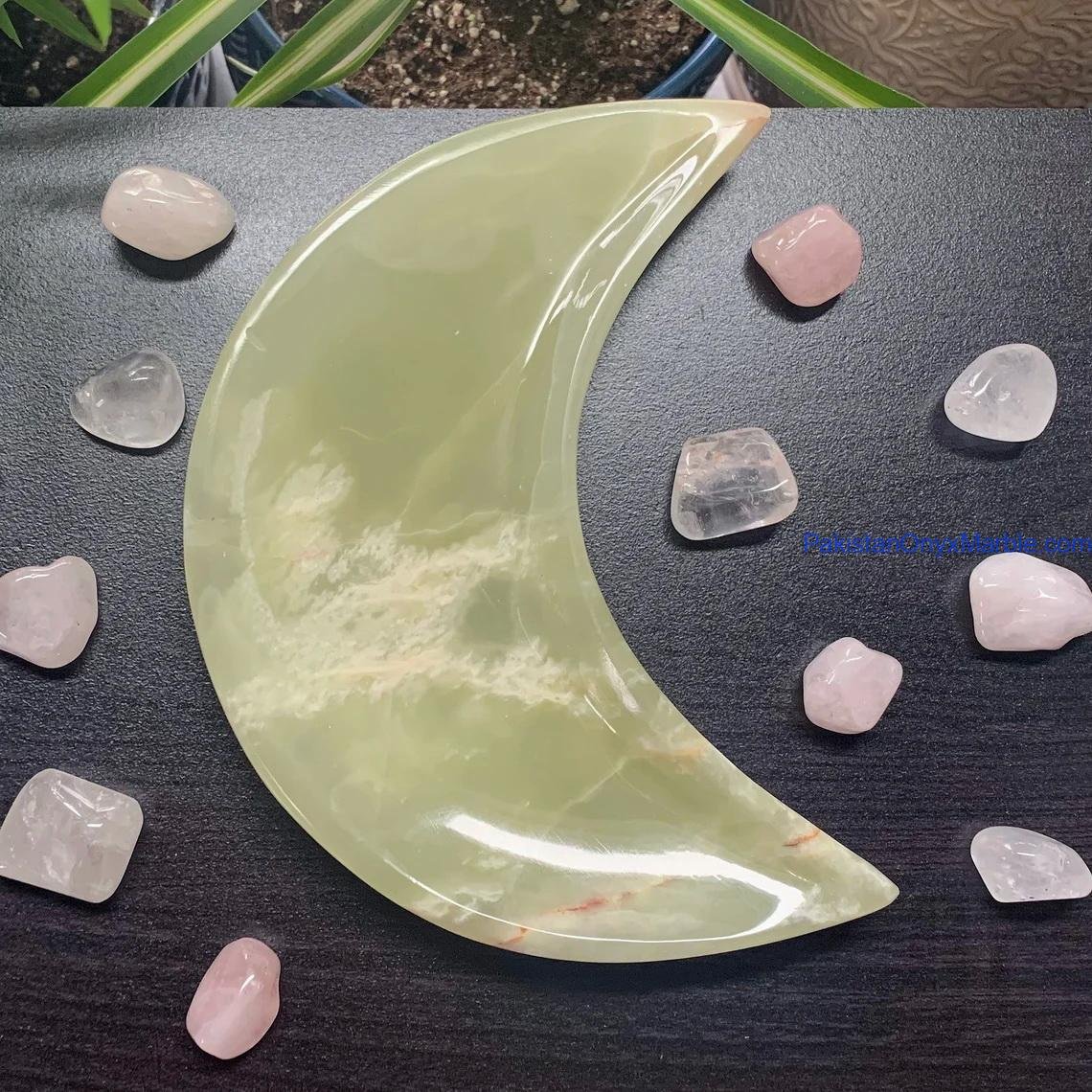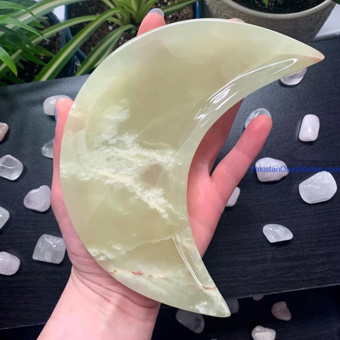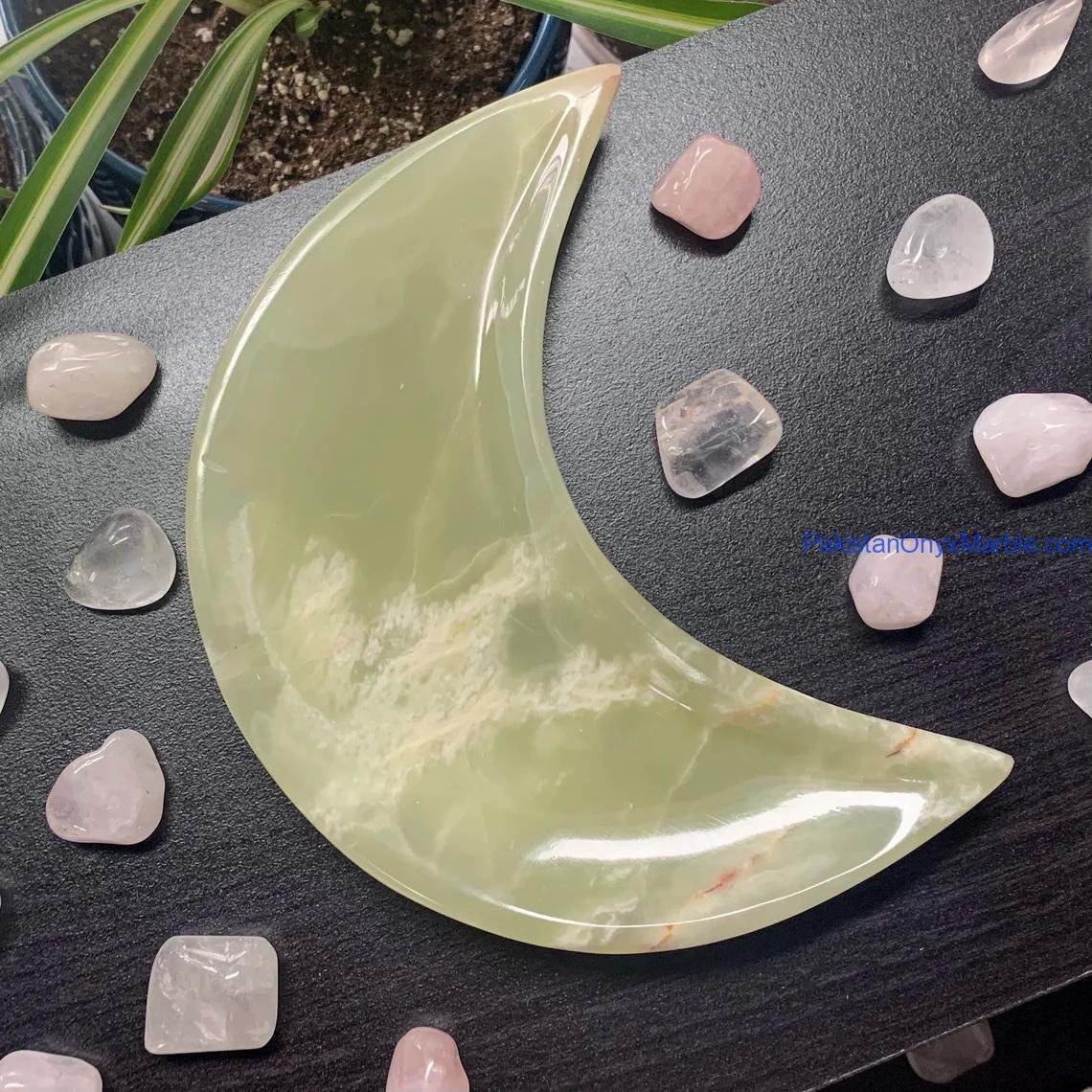 Pakistan Onyx Marble manufactures premium Light Green Onyx Moon Trays, carved from Grade-A Light Green Onyx sourced directly from Pakistan. Each tray is sculpted from a single solid block, displaying the soft pastel-green color, subtle veining, and gentle natural translucency of the stone. The crescent moon–shaped silhouette offers a unique, artistic, and elegant form perfect for luxury décor, serving, gifting, and boutique retail displays.