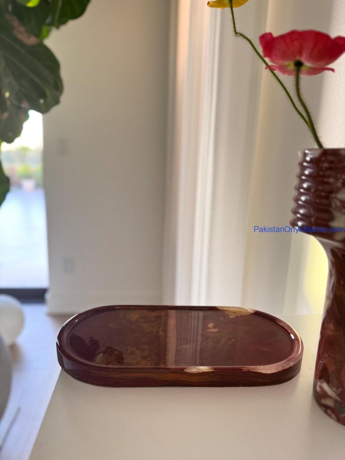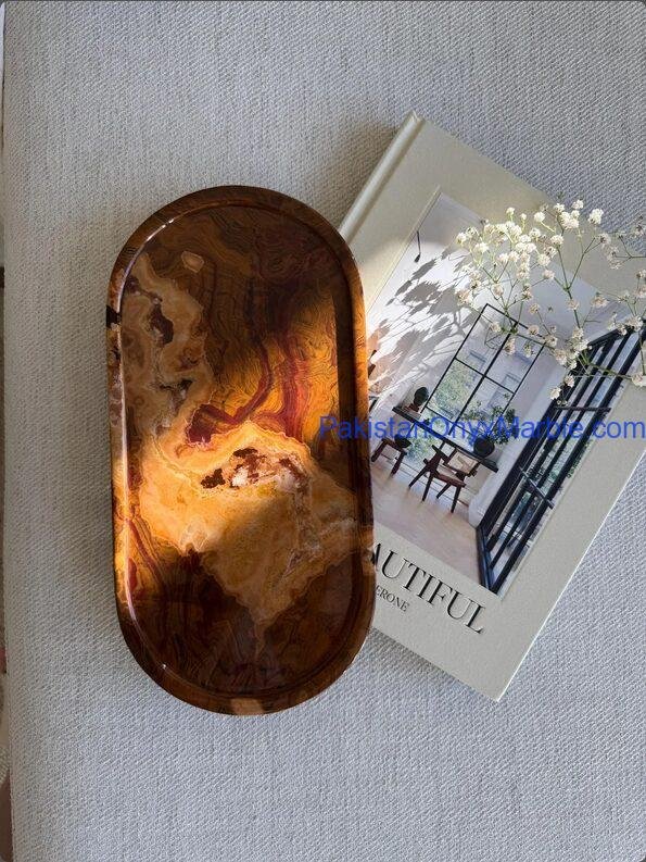Pakistan Onyx Marble manufactures premium Multi Brown Onyx Oval Trays carved from Grade-A multi-toned Brown Onyx sourced directly from Pakistan. Each tray is made from a single solid block, showcasing the stone’s natural blend of browns, honey tones, caramel waves, amber streaks, and ivory banding. The oval silhouette provides a smooth, elegant, and spacious serving surface—perfect for décor styling, kitchen use, vanity organization, and boutique retail display.