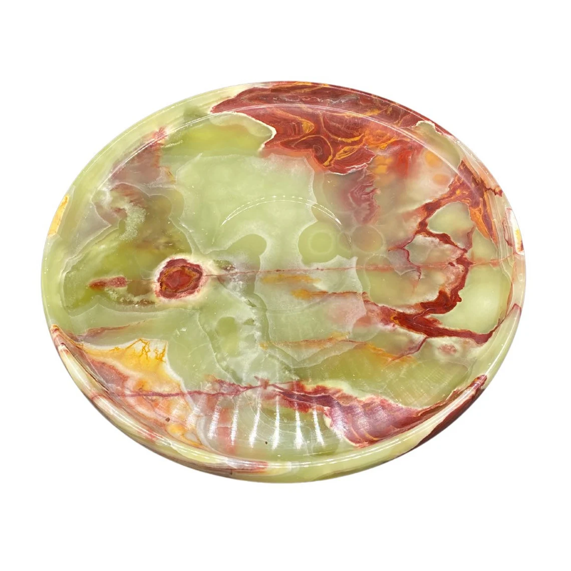 Multi Green Onyx is one of the most dramatic and visually striking onyx types. It combines green, brown, honey, white, and beige tones, creating bold patterns that look expensive and eye-catching on trays.