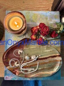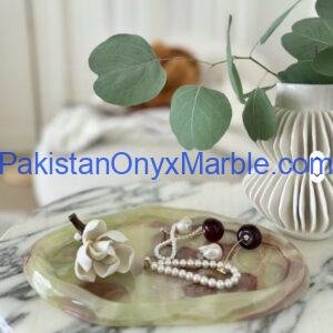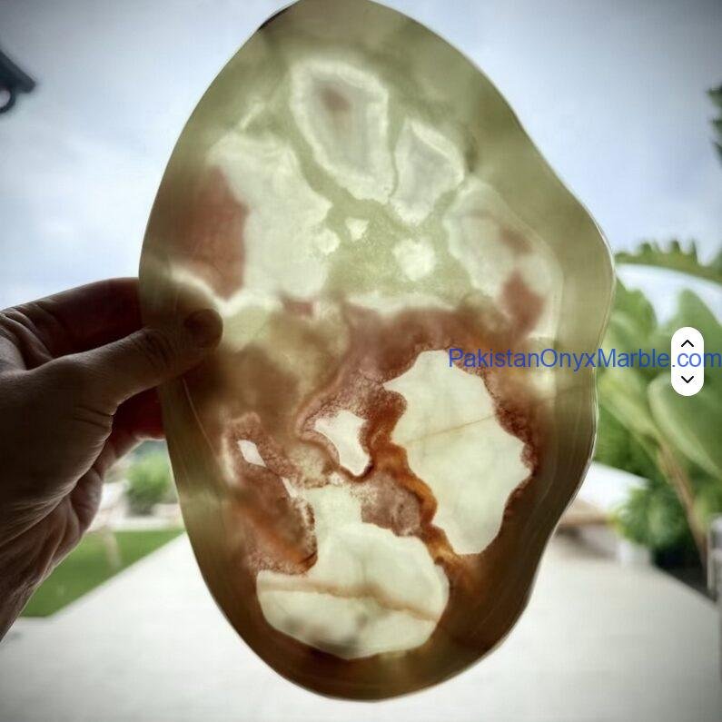 Pakistan Onyx Marble produces premium Multi Green Onyx Irregular Trays, hand-carved from Grade-A Multi-Tone Green Onyx sourced directly from Pakistan. Each tray is crafted from a single natural block, preserving the stone’s organic contours and vibrant color variation—mint green, olive, jade, sea-green, and creamy white veining. The freeform irregular silhouette gives every tray a one-of-a-kind sculptural look, making it ideal for luxury décor styling, premium serving, vanity organization, and boutique retail displays.