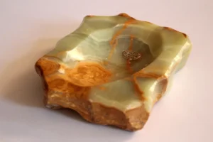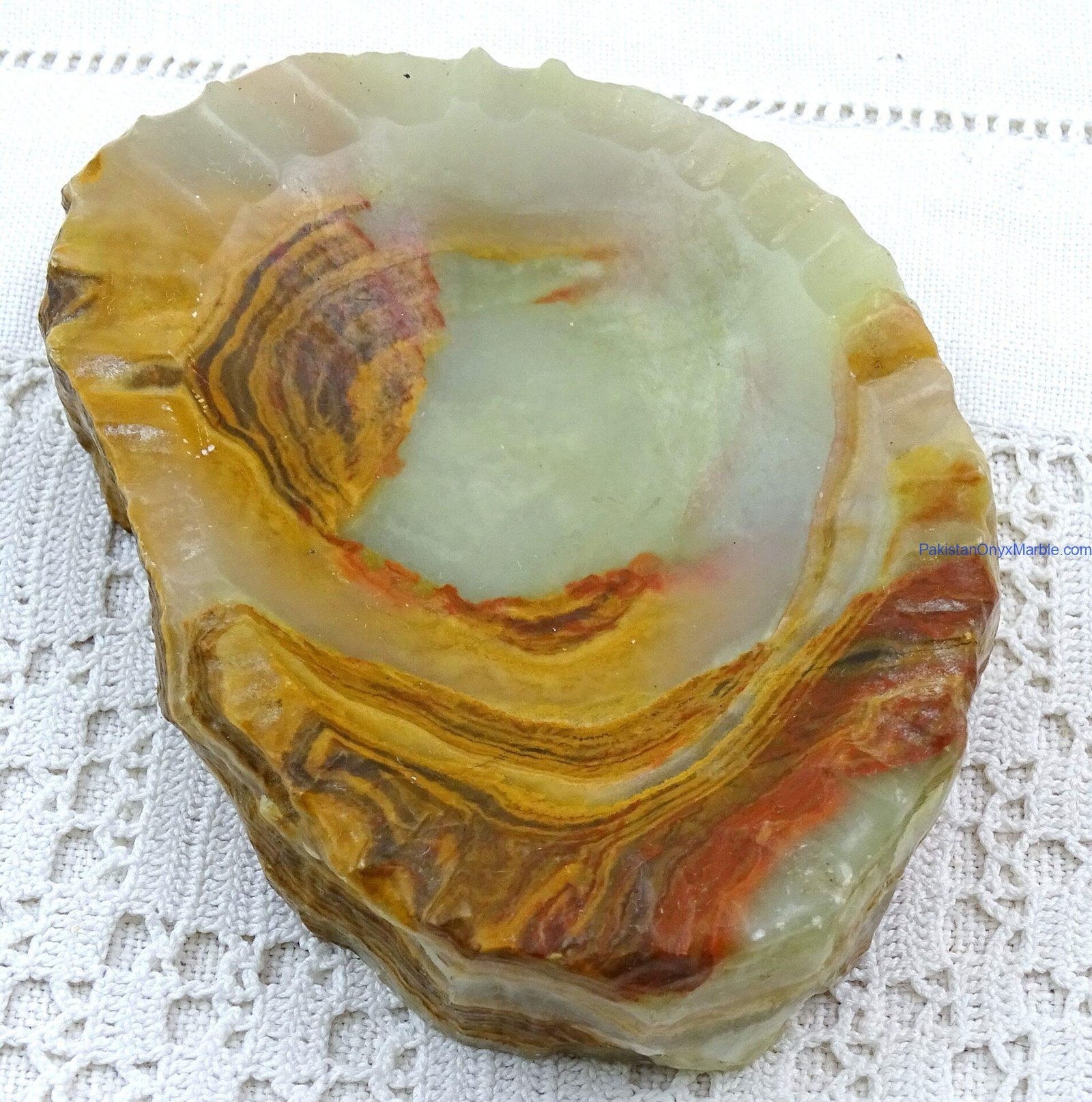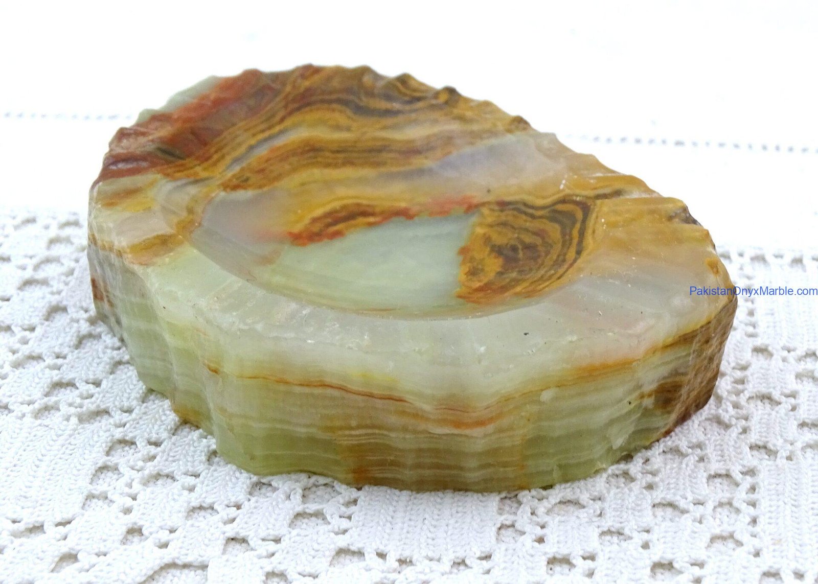 Pakistan Onyx Marble produces premium Multi Green Onyx Trays with Rough Raw Outer Side Design, carved from Grade-A Multi-Tone Green Onyx sourced directly from Pakistan. Each tray is crafted from a single natural block of onyx, featuring stunning tones of mint green, jade, olive, pistachio, sea-green, and creamy white banding.