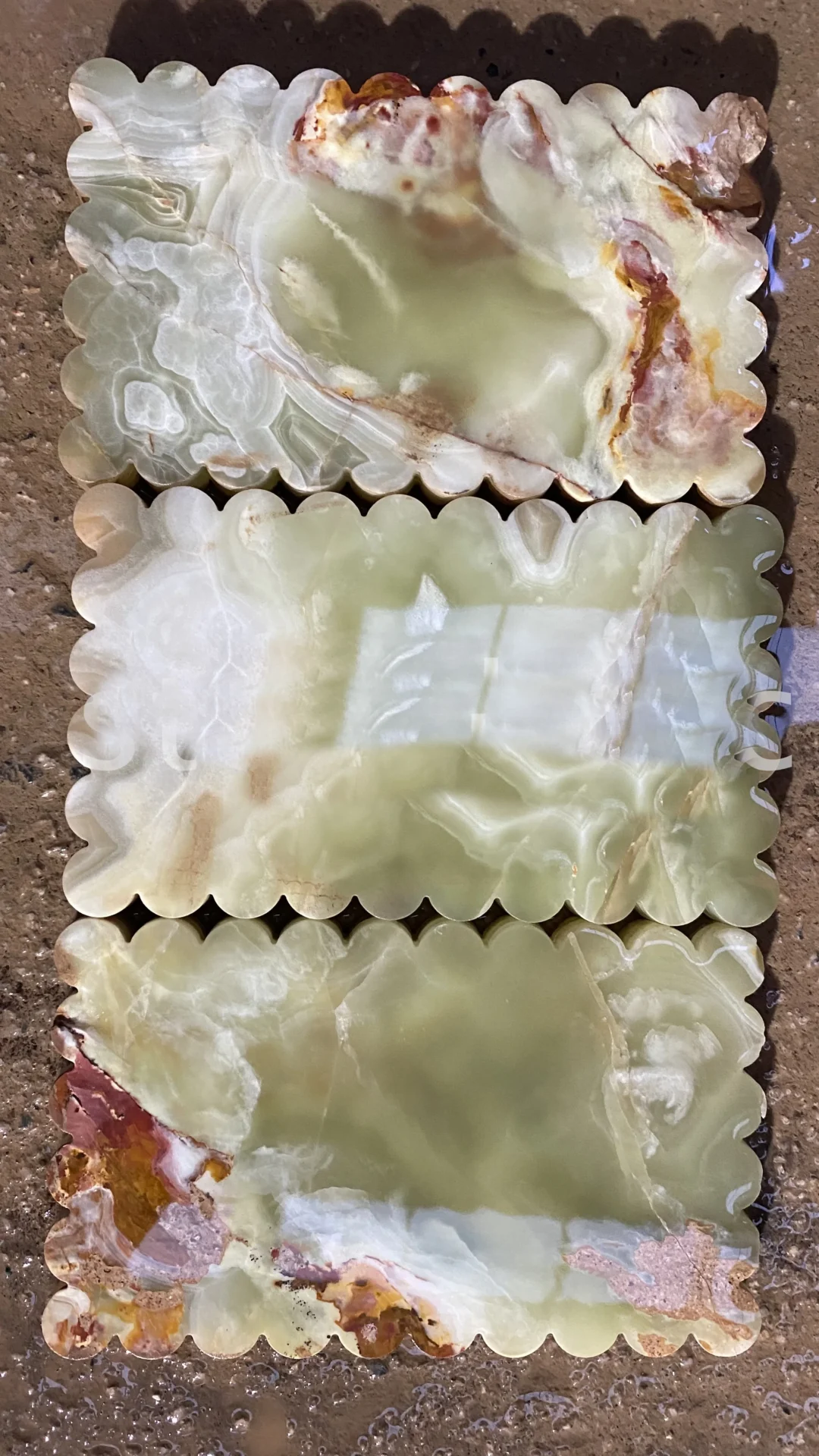 Each tray carved from a single Multi Green Onyx block