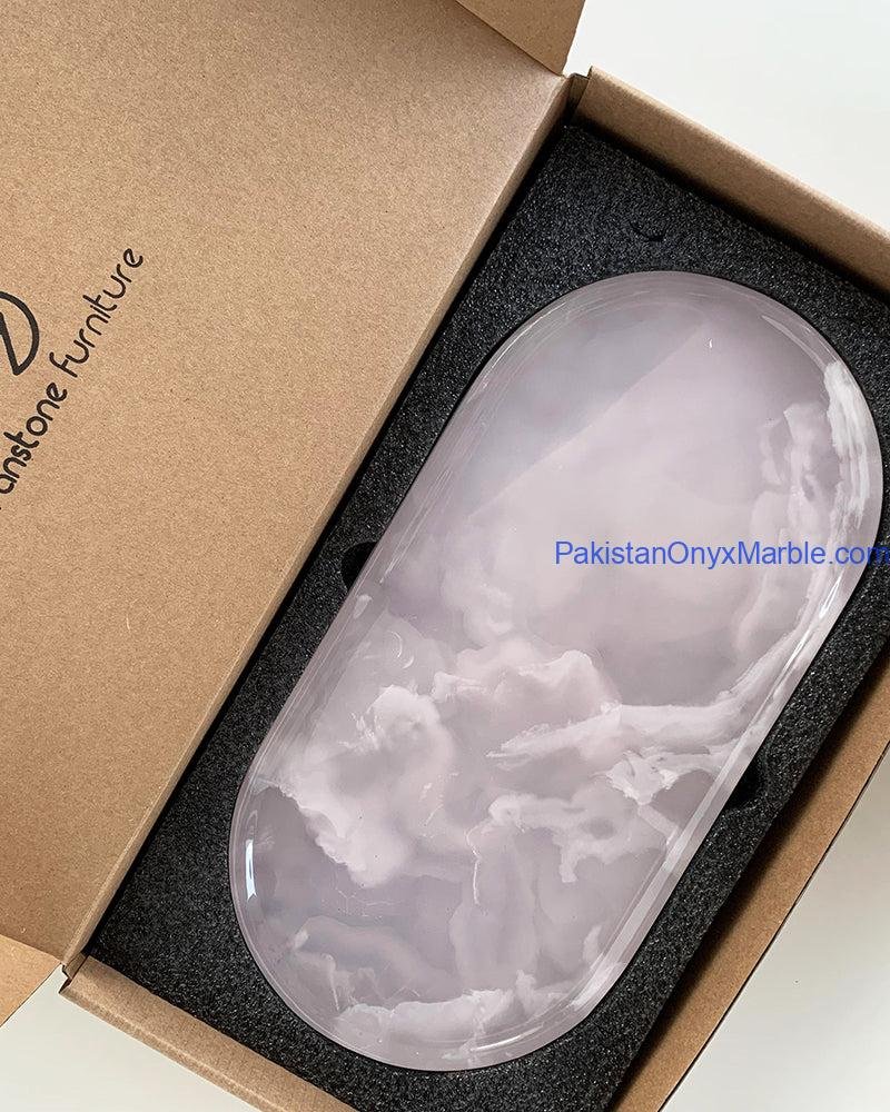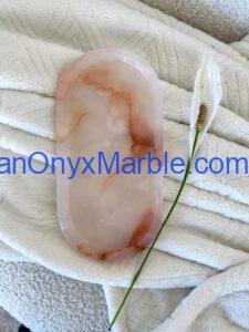Pakistan Onyx Marble manufactures premium Pink Onyx Oval Trays carved from Grade-A Natural Pink Onyx sourced from top quarries in Pakistan. Each tray is cut from a single solid stone block, revealing elegant rose tones, soft blush gradients, peach veining, milky layers, and natural translucent banding.