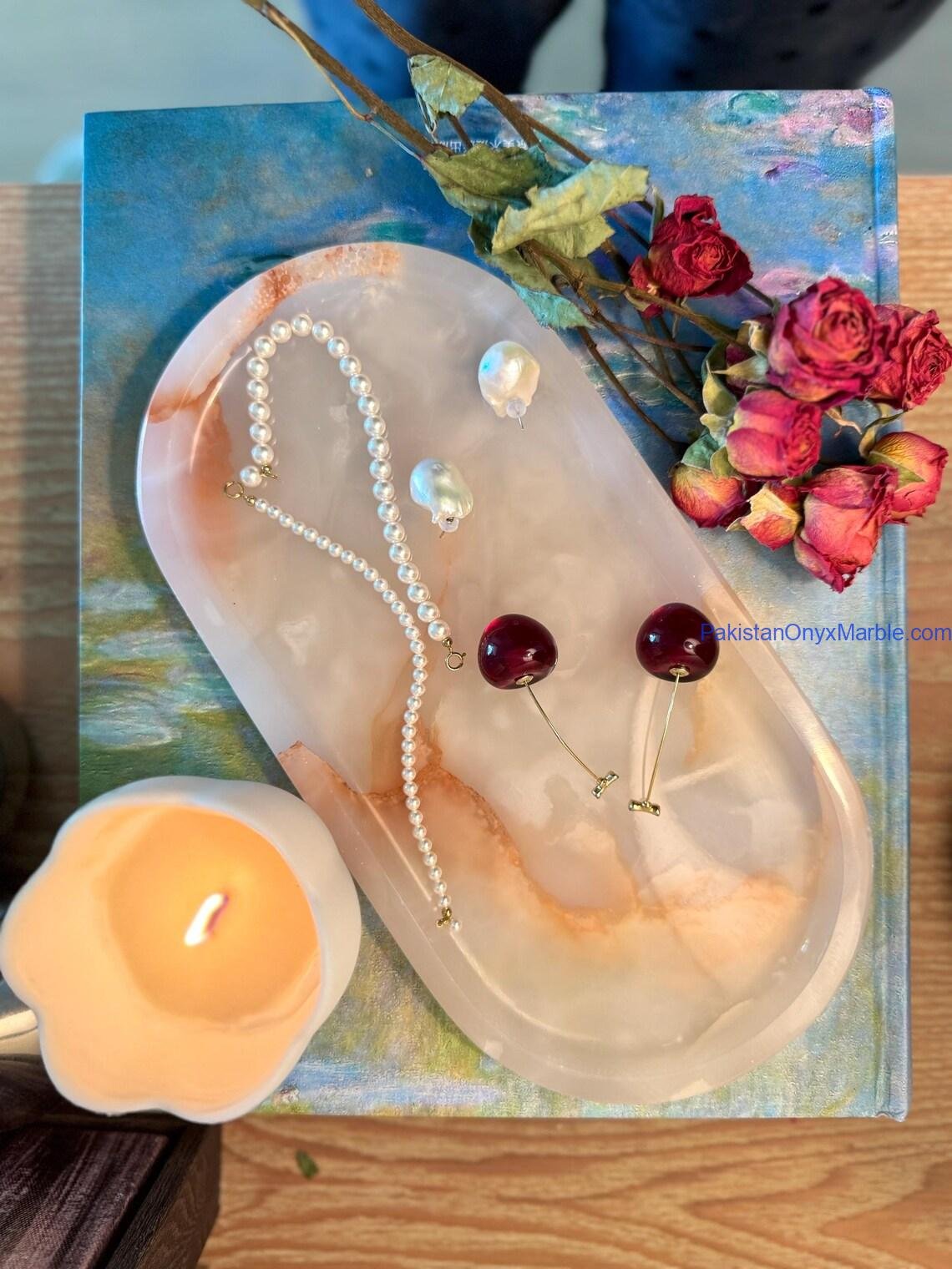 The oval silhouette provides a smooth, elegant, and spacious form ideal for luxury décor styling, serving, vanity organization, and boutique retail display. Every tray is one-of-a-kind due to natural onyx variation.