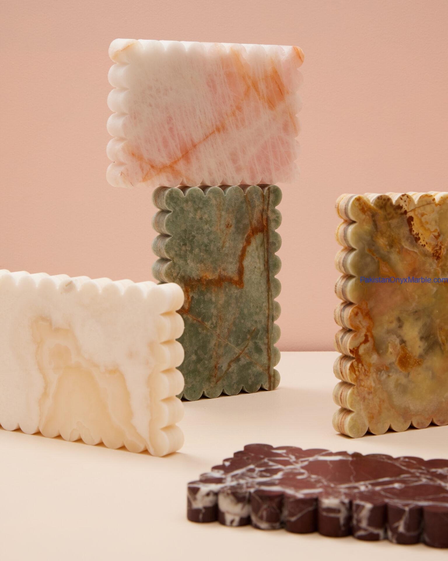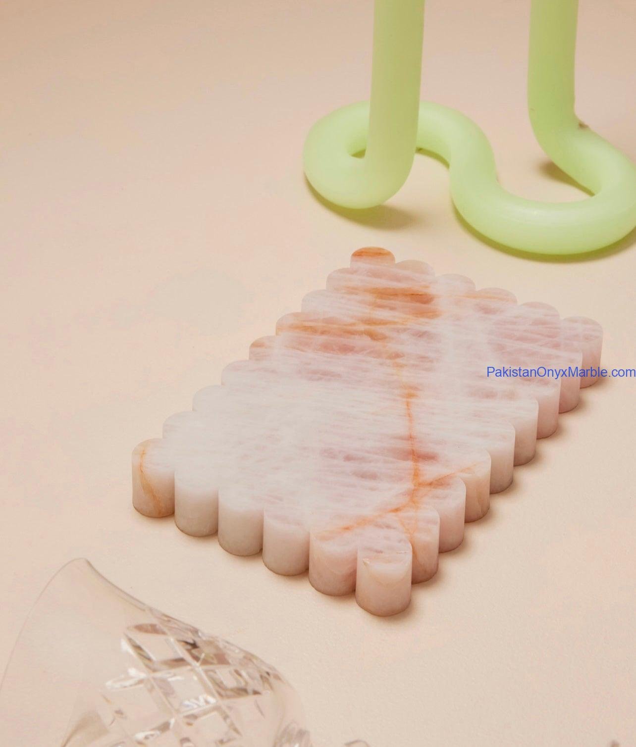 Pakistan Onyx Marble manufactures premium Pink Onyx Scalloped Rectangle Trays carved from Grade-A Natural Pink Onyx sourced from Pakistan. Each tray is crafted from a single solid stone block, revealing distinctive rose tones, blush pink gradients, peach veining, milky layers, and translucent natural banding.