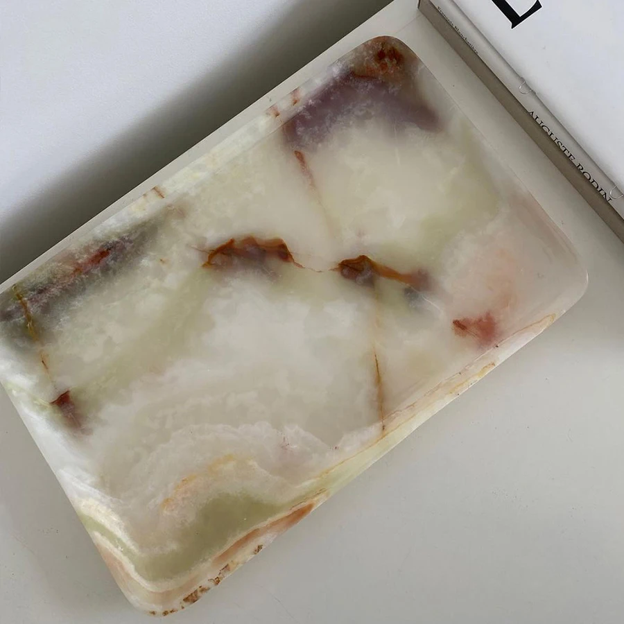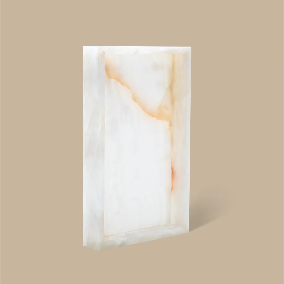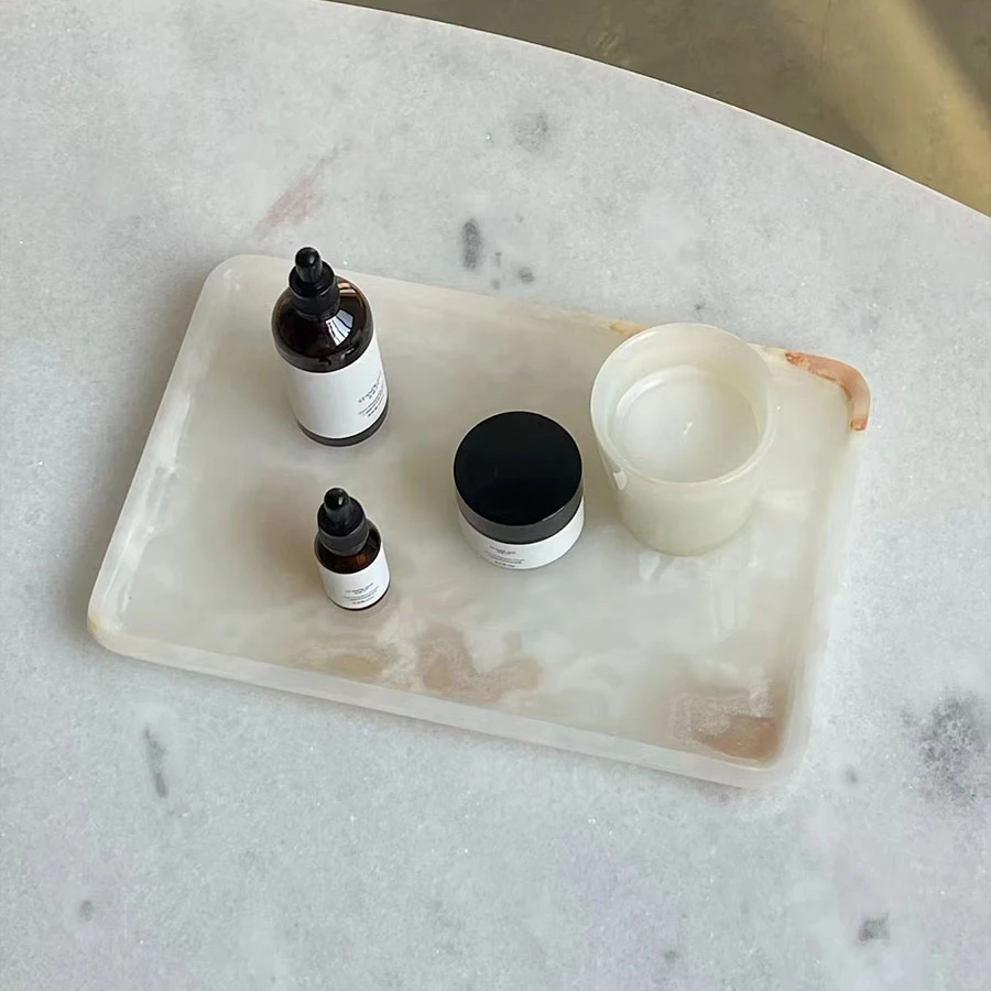 Each tray is produced from a single solid block of onyx, ensuring durability, consistent thickness, and a polished luxury finish.