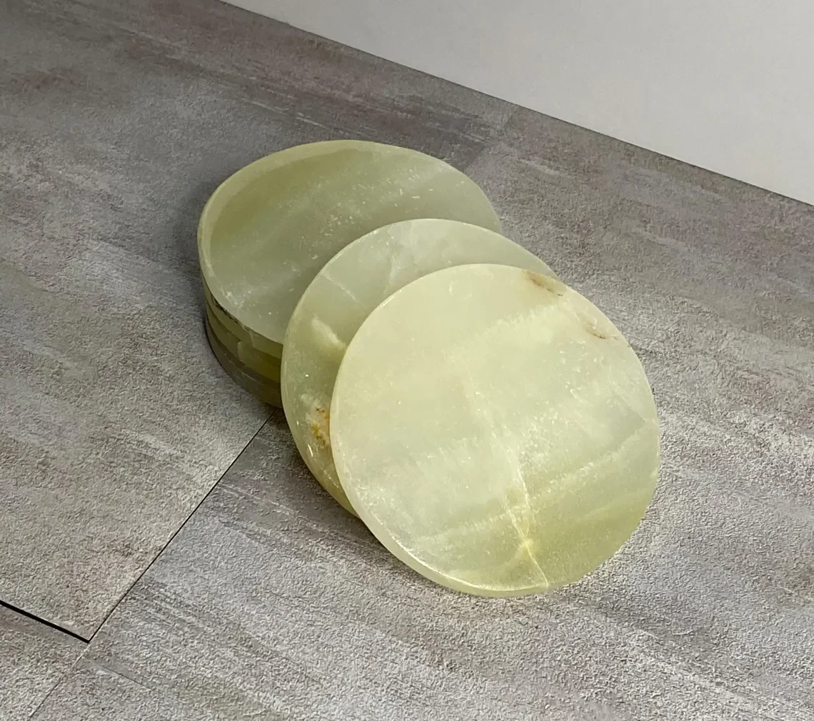 Afghan Green Jade Onyx coaster pieces are premium single-piece stone coasters crafted from natural Afghan Green Jade Onyx, highly valued for its deep jade-green color, smooth texture, and rich natural translucency. This stone is denser and more vibrant than standard green onyx, giving each coaster a luxury, high-end feel. Supplied as individual pieces, these coasters are ideal for replacements, mix-and-match assortments, hospitality use, and bulk wholesale supply. Pakistan Onyx Marble is a direct manufacturer, wholesaler, and exporter serving global markets.
