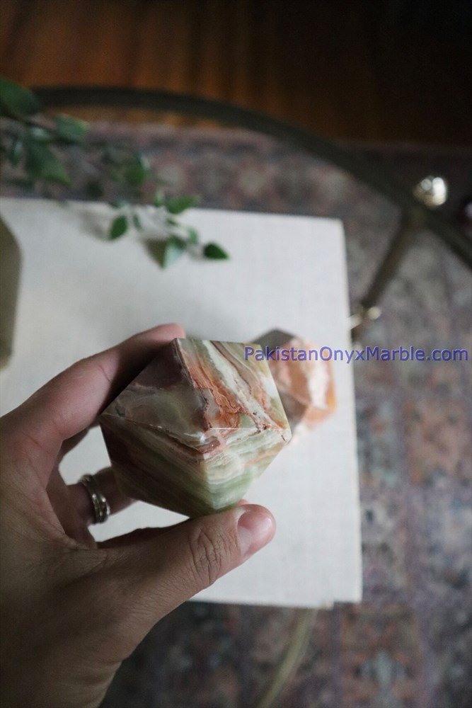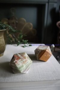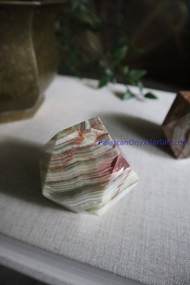Décor: Multi Green Onyx Diamond Geometrical Tetrahedrons serve as elegant and eye-catching decorative pieces for homes, offices, and spiritual spaces.