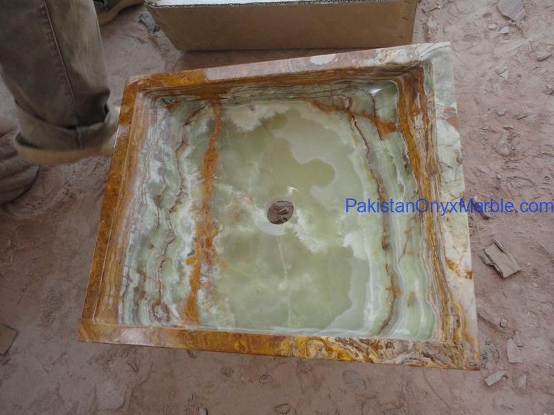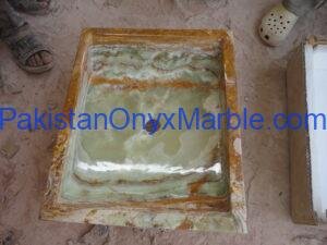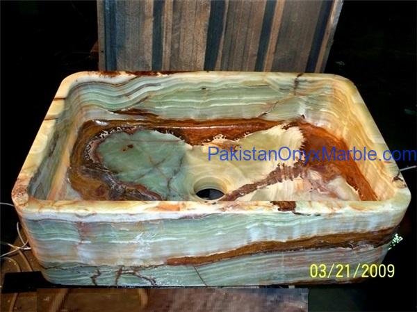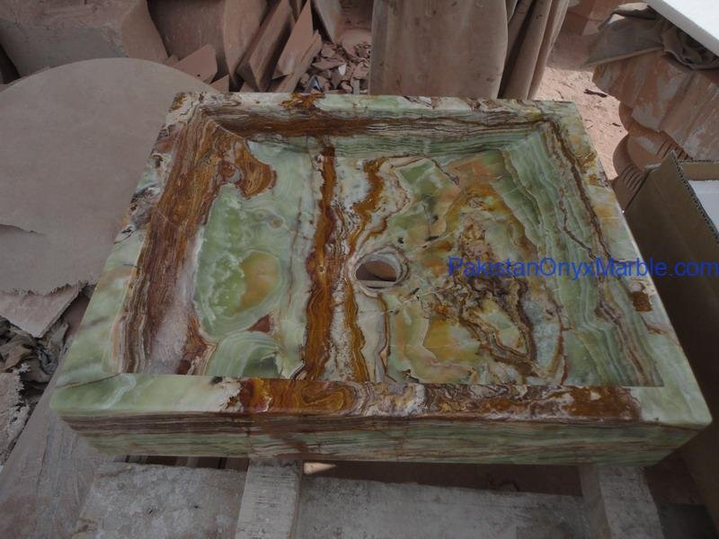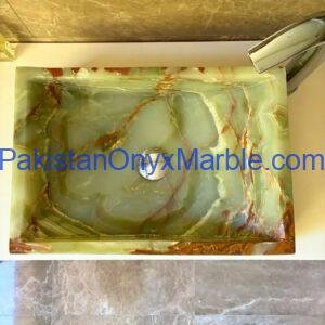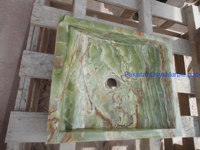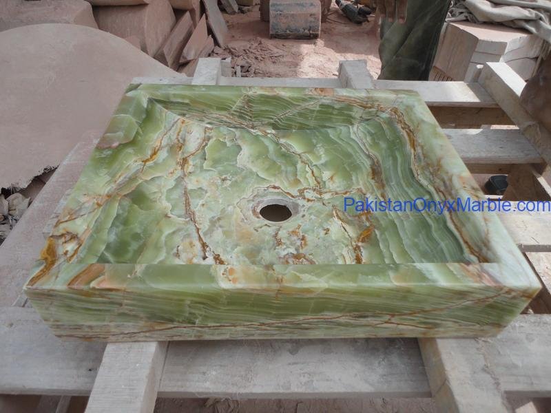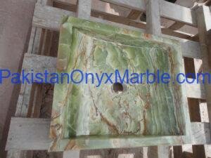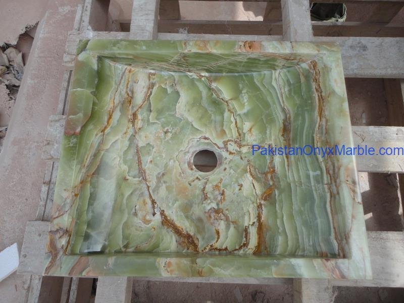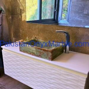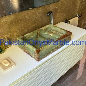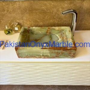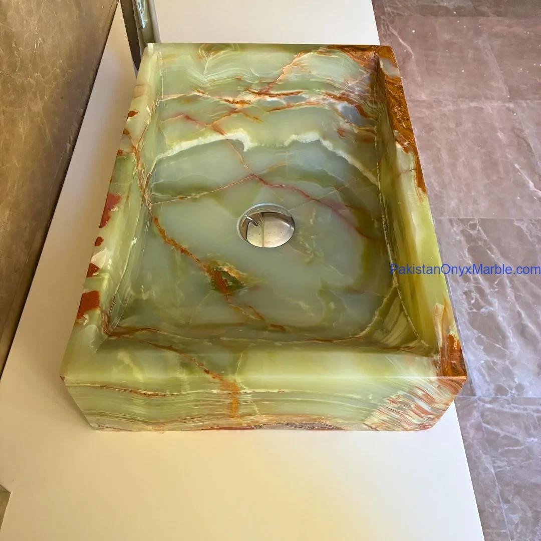 Pakistan Onyx Marble presents a premium collection of Dark Green Onyx Sinks, crafted from 100% natural onyx stone. Known for its deep green tones, bold veining, and rich layered patterns, this stone delivers a strong, luxurious visual impact ideal for high-end interiors.