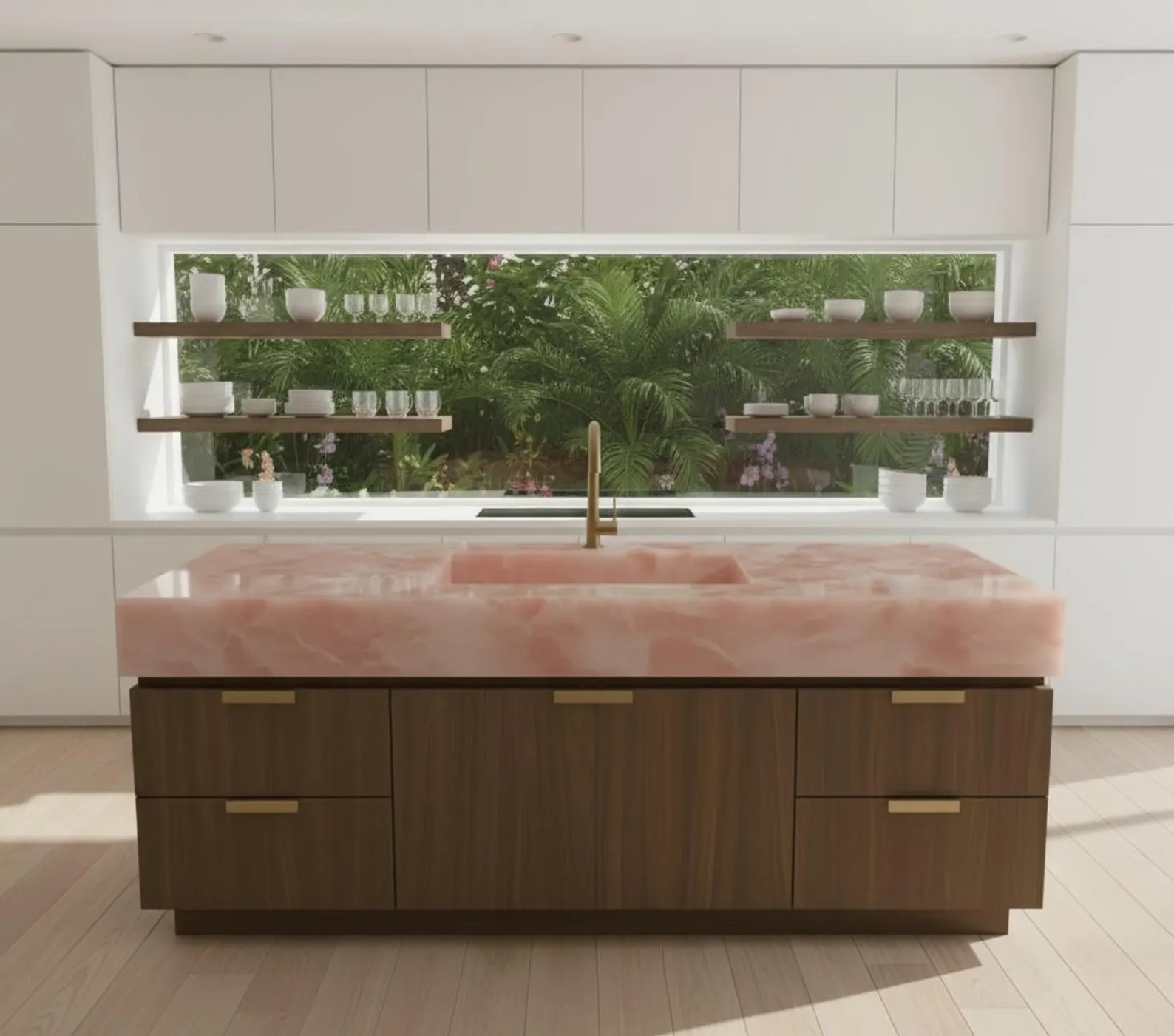 Polished Pink Onyx creates a glowing effect under lighting, making it ideal for luxury interiors.