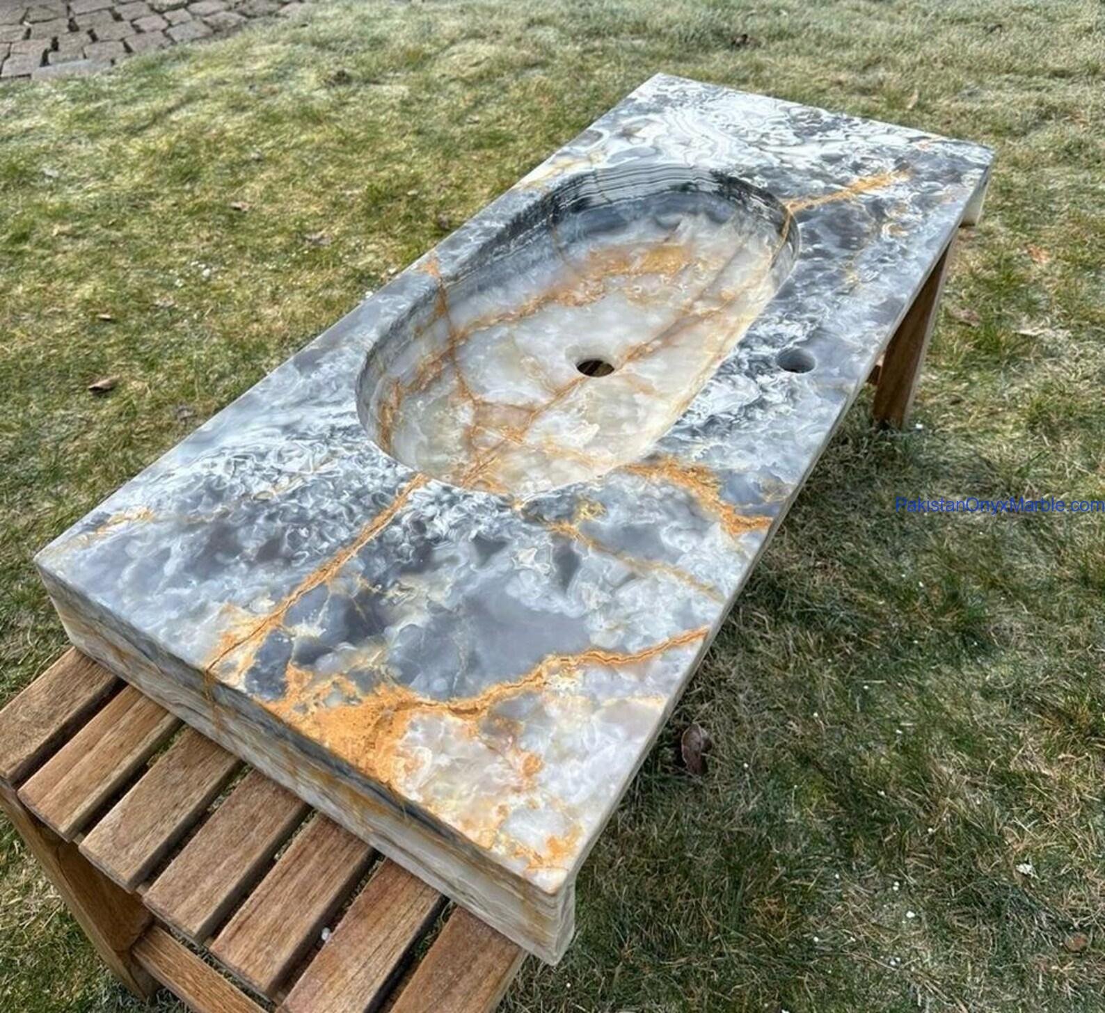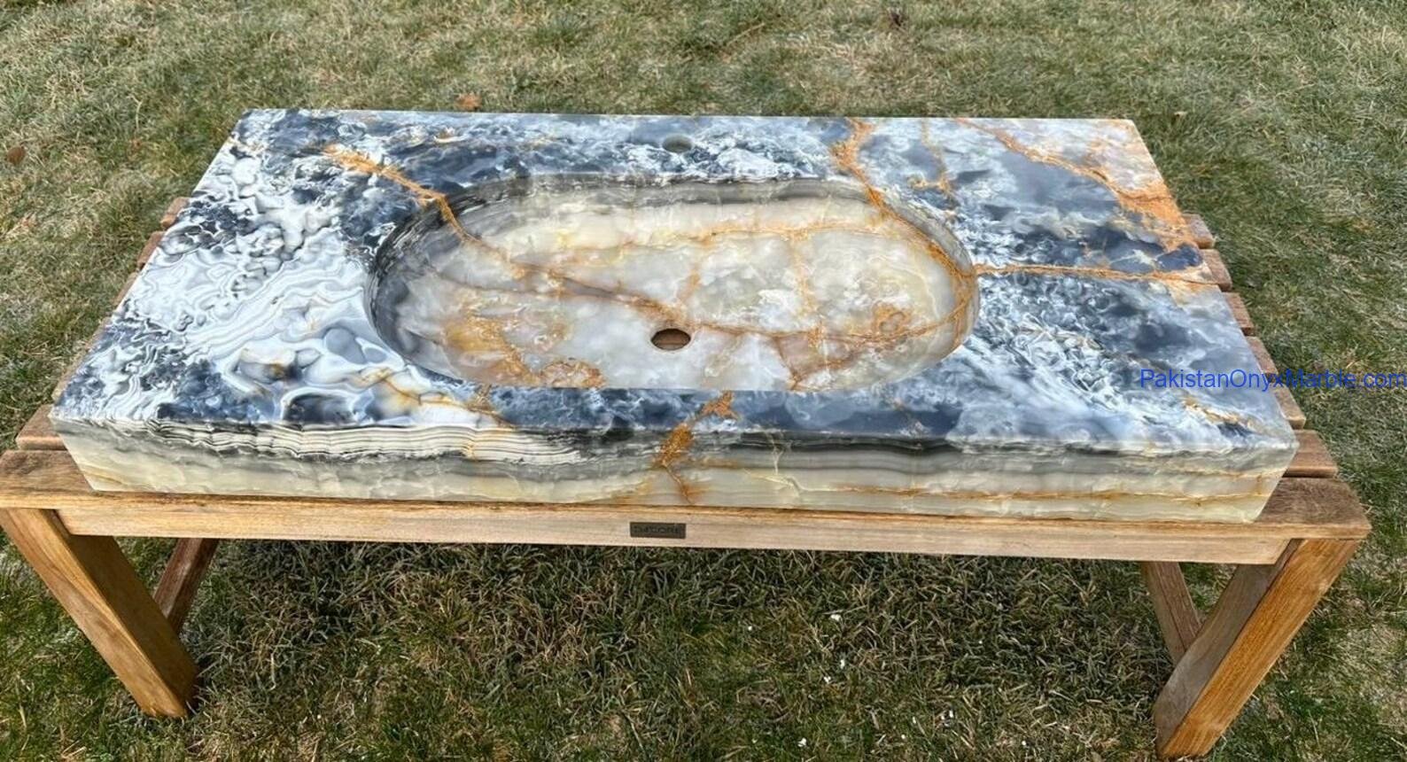 Pakistan Onyx Marble presents a premium collection of Blue Onyx Sinks, crafted from 100% natural blue onyx stone. Known for its rare blue tones, striking banding patterns, and high translucency, Blue Onyx is one of the most exclusive and high-value natural stones used in luxury interiors.