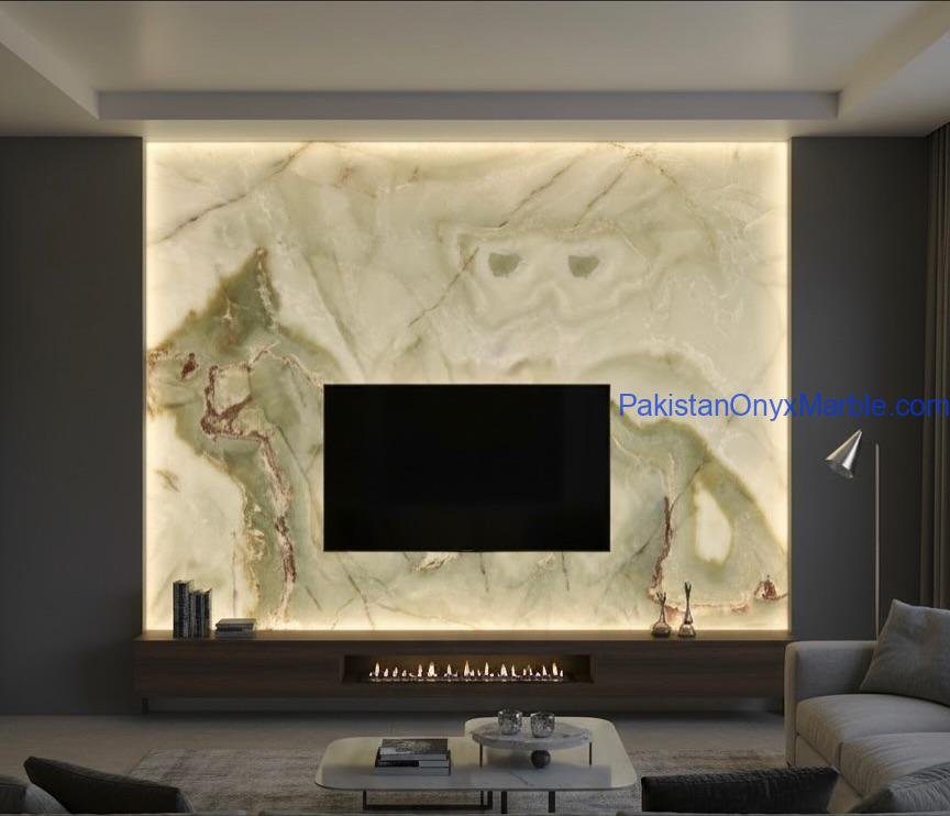 Fireplace Surrounds: Green onyx slabs can enhance the visual appeal of fireplace surrounds, adding a touch of opulence to the space.