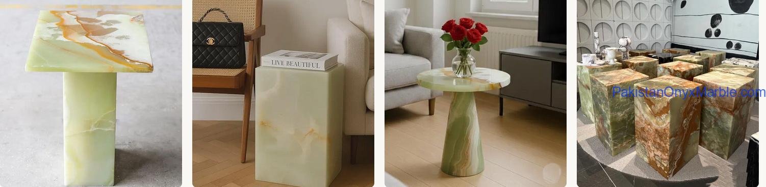 Onyx Side Tables: Onyx side tables offer a convenient surface for placing drinks, books, or decor items. They can come in various heights and shapes to suit different arrangements.