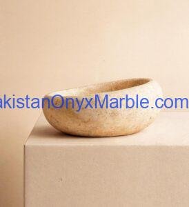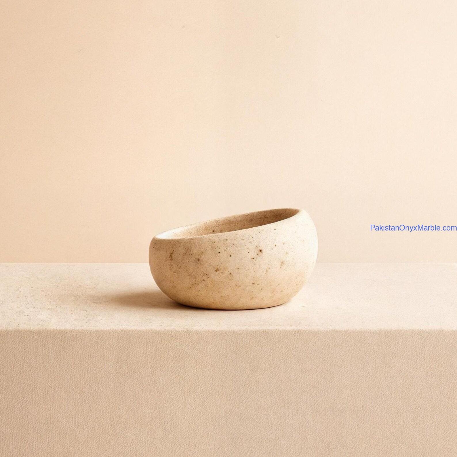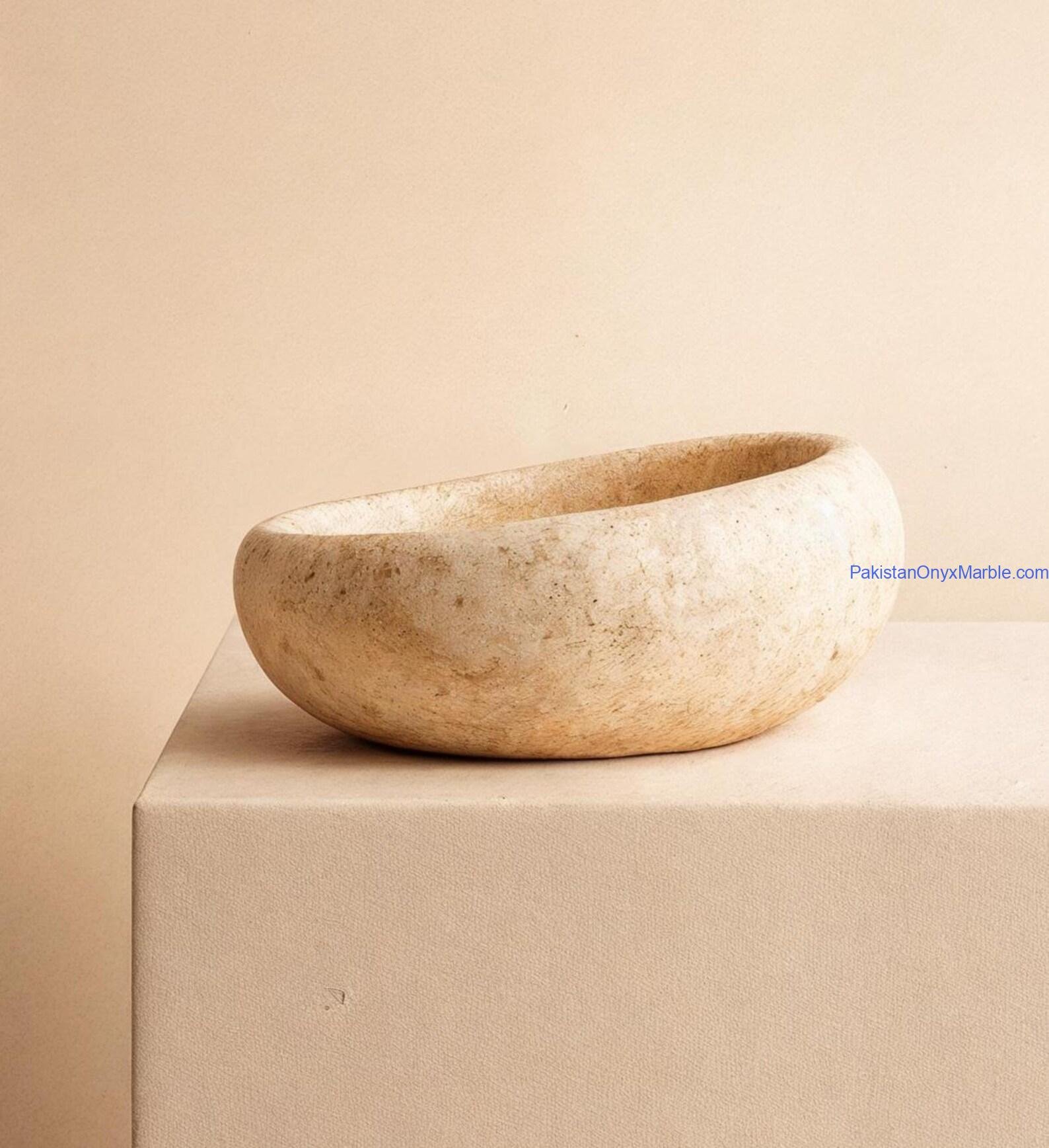 Pakistan Onyx Marble manufactures premium Travertine Bean-Shaped Bowls, carved from Grade-A Natural Travertine featuring warm beige, cream, ivory, and vein-cut patterns.