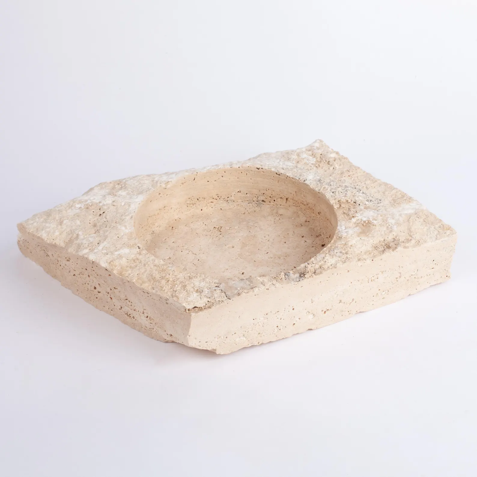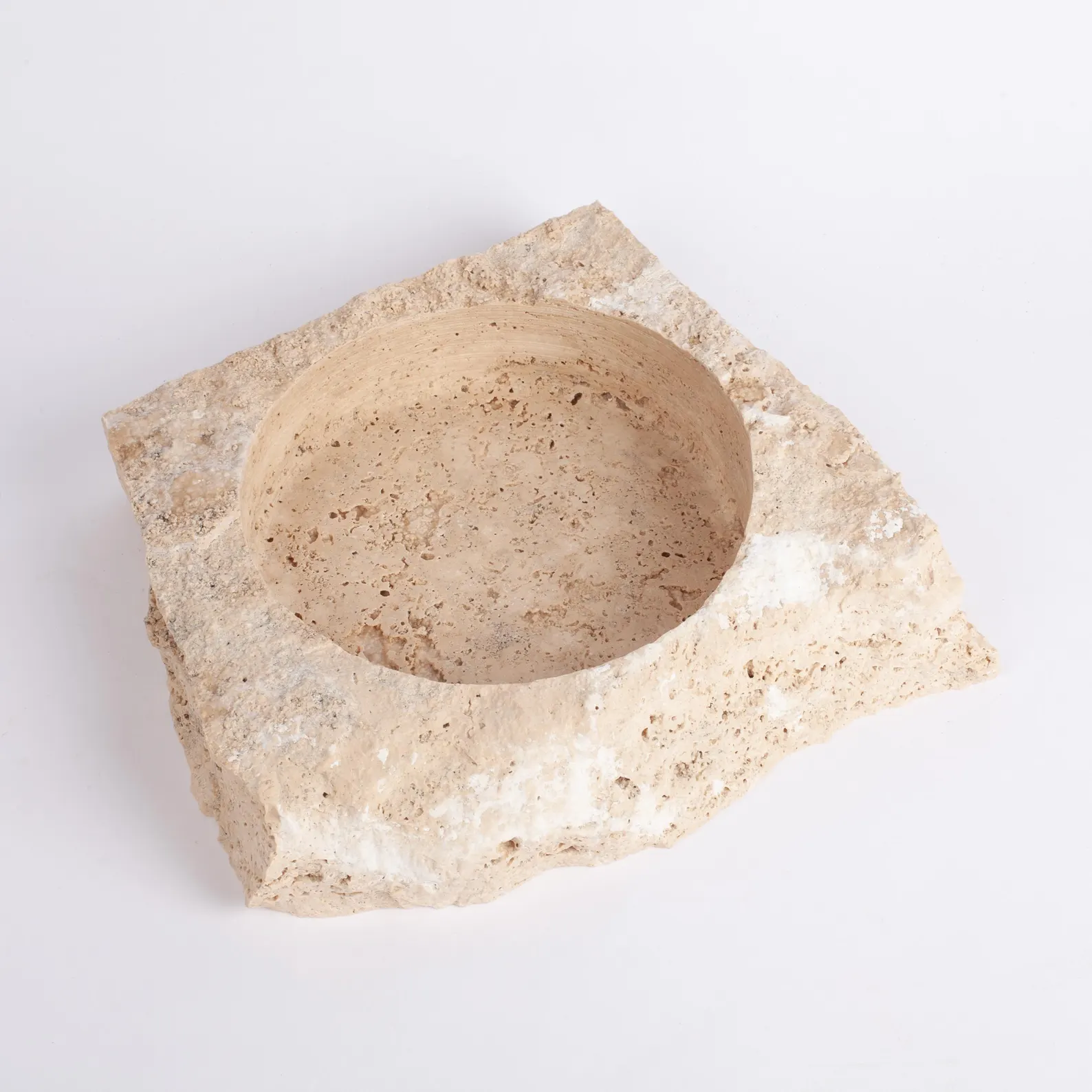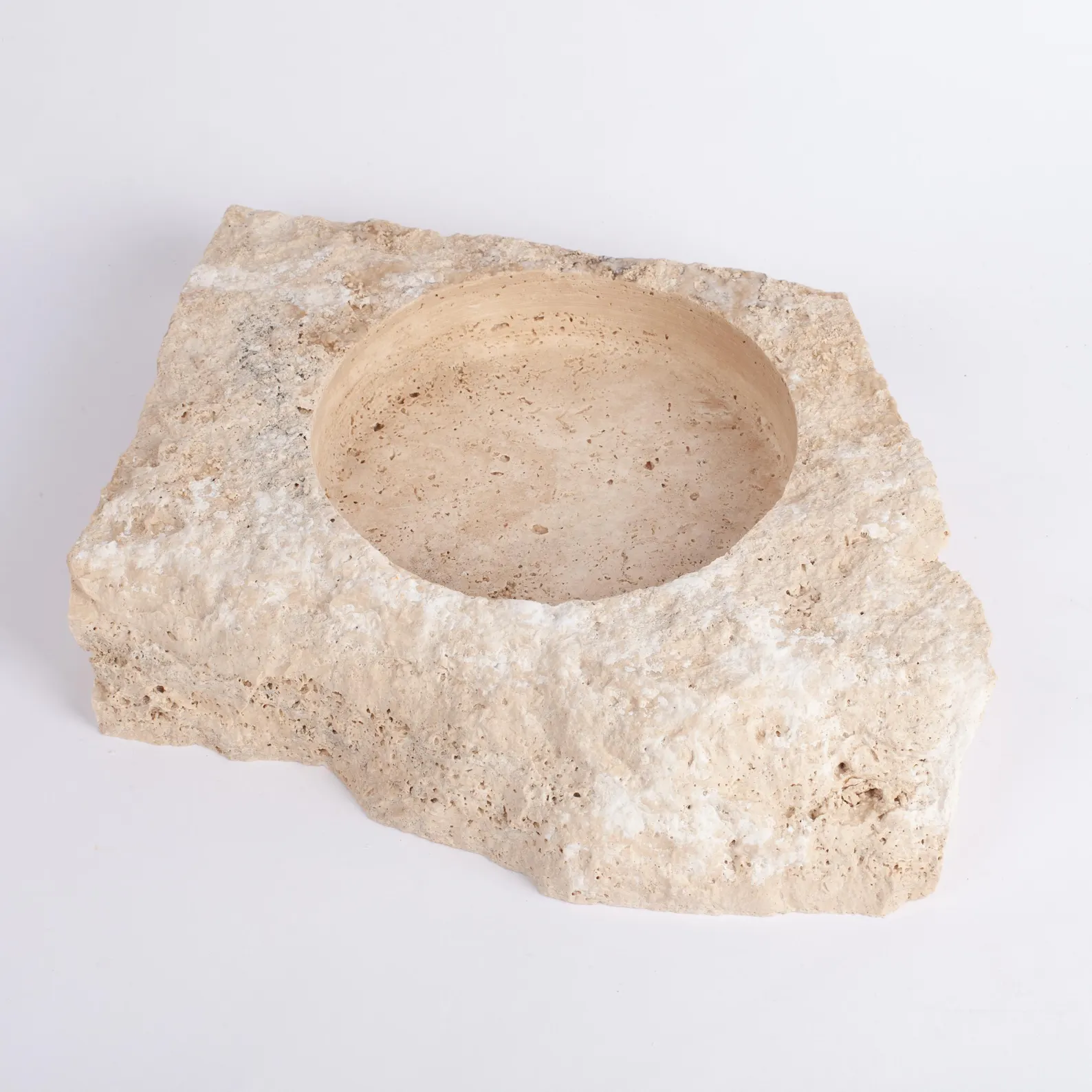 Each piece is carved from a single Travertine block, accentuating natural formations, pores, raw edges, and earthy beige tones.